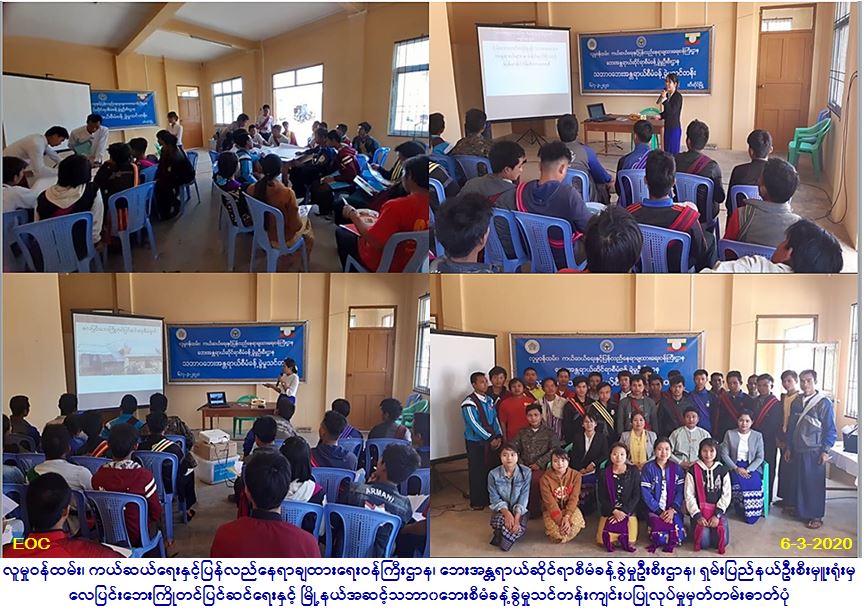 လူမှုဝန်ထမ်း၊ ကယ်ဆယ်ရေးနှင့်ပြန်လည်နေရာချထားရေးဝန်ကြီးဌာန၊ ဘေးအန္တရာယ်ဆိုင်ရာစီမံခန့်ခွဲမှုဦးစီးဌာန၊ ရှမ်းပြည်နယ် ဦးစီးမှူးရုံးမှ တာဝန်ရှိသူများသည် (၆.၃.၂၀၂၀)ရက်နေ့မှ (၇.၃.၂၀၂၀)ရက်နေ့အထိ ဆီဆိုင်မြို့နယ်ဦးစီးမှူးရုံး အစည်း အဝေးခန်းမတွင် လေပြင်းဘေးကြိုတင်ပြင်ဆင်ရေးနှင့် မြို့နယ်အဆင့်သဘာ၀ဘေးစီမံခန့်ခွဲမှုသင်တန်းအား ဖွင့်လှစ်ခဲ့ရာ ဆီဆိုင်မြို့နယ်အတွင်းရှိ ရပ်ကွက်အုပ်ချုပ်ရေးမှူးများနှင့် ရပ်ကျေးစာရေးများ အပါအဝင် သင်တန်းသား/သူ (၅၀) ဦးတက်ရောက်ခဲ့ကြောင်း သတင်းရရှိပါသည်။