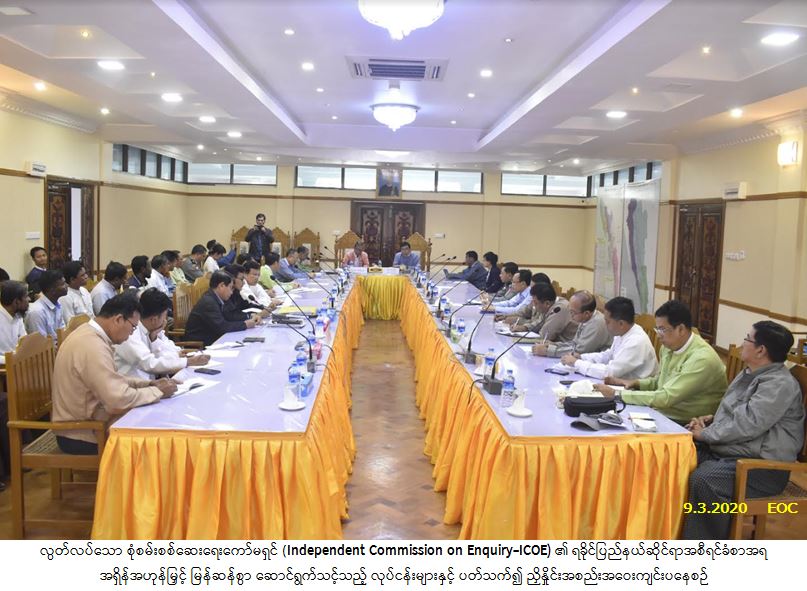 ရခိုင်ပြည်နယ်ဆိုင်ရာ ဆောင်ရွက်ချက်များတွင် လွတ်လပ်သော စုံစမ်းစစ်ဆေးရေး ကော်မရှင် (ICOE) ၏ အကြံပြုချက်များမှ အရှိန်အဟုန်မြှင့် မြန်ဆန်စွာဆောင်ရွက်သင့်သည့် လုပ်ငန်းများနှင့် ပတ်သက်၍ လက်ရှိဆောင်ရွက်ချက်များကို ပြန်လည်သုံးသပ်ခြင်း၊ ရှေ့ဆက်ဆောင်ရွက်မည့်လုပ်ငန်းများကို ညှိနှိုင်း ဆောင်ရွက်ခြင်းနှင့် တစ်ဖက်နိုင်ငံသို့ တိမ်းရှောင်ထွက်ပြေးခြင်းမပြုသည့် နေရပ်စွန့်ခွာသူများ နေထိုင်ရာ ကျေးရွာများထဲမှ ကျေးရွာ(၇)ရွာကို ပြန်လည်နေရာချထားရေးဆောင်ရွက်နေမှုများနှင့် ပတ်သက်၍ ကျေးရွာ နေသူများ၏ ကိုယ်စားလှယ်များနှင့် တွေ့ဆုံဆွေးနွေးခြင်းကို ယနေ့နံနက်ပိုင်းက ရခိုင်ပြည်နယ်၊ စစ်တွေမြို့ရှိ၊ ပြည်နယ်ဧည့်ဂေဟာအစည်းအဝေးခန်းမ၌ ကျင်းပခဲ့ပါသည်။
