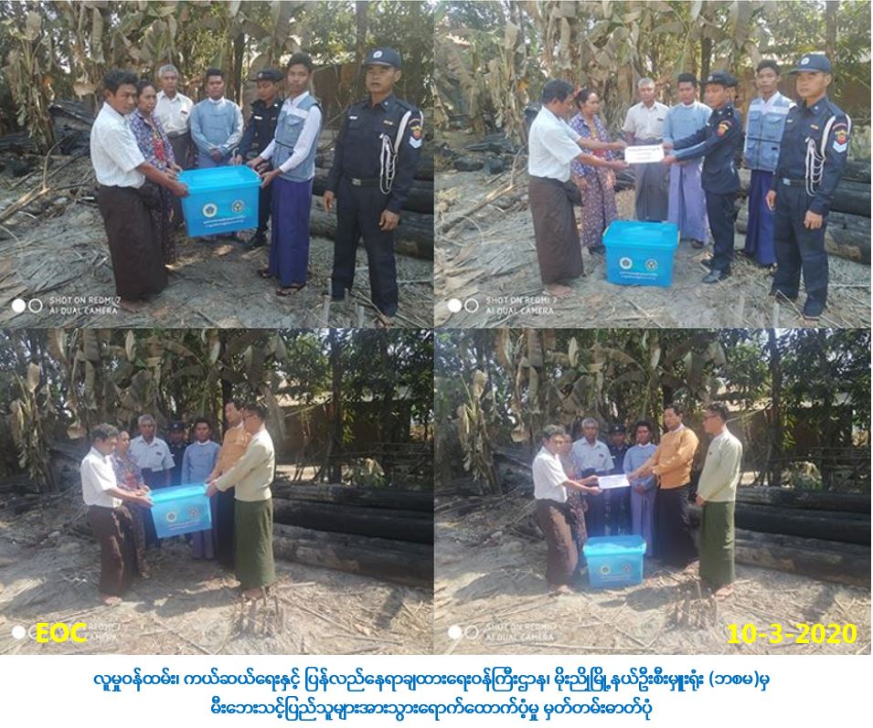 လူမှုဝန်ထမ်း၊ ကယ်ဆယ်ရေးနှင့် ပြန်လည်နေရာချထားရေးဝန်ကြီးဌာန၊ ဘေးအန္တရာယ်ဆိုင်ရာစီမံ ခန့်ခွဲမှုဦးစီးဌာန၊ မိုးညိုမြို့နယ်ဦးစီးမှူးရုံးမှ တာဝန်ရှိသူများသည် (၈-၃-၂၀၂၀)ရက်နေ့၊ (၂၀:၂၀)နာရီအချိန် တွင် ပဲခူးတိုင်းဒေသကြီး၊ သာယာဝတီခရိုင်၊ မင်းလှမြို့နယ်၊ ကြို့ကုန်း(၂)ကျေးရွာအုပ်စု၊ ကြို့ကုန်း (၂) ကျေးရွာ၌ ဖြစ်ပွားခဲ့သော မီးဘေးမှ မီးဘေးသင့် ပျက်စီးနေအိမ် (၁) လုံးအတွက် အိမ်ဆောက်ပစ္စည်းဖိုး ထောက်ပံ့ငွေ (၁၀၀၀၀၀/-)ကျပ်၊ အိမ်ထောင်စု (၁)စုရှိ လူဦးရေ(၄)ဦး တို့အတွက် ဆန်ရိက္ခာဖိုး ထောက်ပံ့ ငွေ (၈၄၀၀/-)ကျပ် စုစုပေါင်းထောက်ပံ့ငွေ (၁၀၈၄၀၀/-) ကျပ် ကယ်ဆယ်ရေးပစ္စည်း(၁၉)မျိုး (ပလပ် စတစ်ပုံးအပါ)(၁)အိမ်ထောင်စာအား (၁၀-၃-၂၀၂၀)ရက်နေ့၊ (၁၀း၀၀)နာရီအချိန်တွင် တိုင်းဒေသကြီး (၁)လွှတ်တော် ကိုယ်စားလှယ်၊ မင်းလှမြို့နယ်အထွေထွေ အုပ်ချုပ်ရေးဦးစီးဌာနမှ တာဝန်ရှိသူများ၊ မြို့နယ်မီးသတ်တပ်ဖွဲ့ဝင်များ၊ ကျေးရွာအုပ်ချုပ်ရေးမှူးနှင့်အတူ မီးဘေးသင့်ပြည်သူထံ သွားရောက် ထောက်ပံ့ပေးအပ်ခဲ့ပါကြောင်း သတင်းရရှိပါသည်။