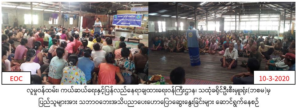 လူမှုဝန်ထမ်း၊ ကယ်ဆယ်ရေးနှင့် ပြန်လည်နေရာချထားရေးဝန်ကြီးဌာန၊ ဘေးအန္တရာယ်ဆိုင်ရာစီမံခန့်ခွဲမှုဦးစီးဌာန၊ သထုံခရိုင်ဦးစီးမှူးရုံးမှဝန်ထမ်းများသည် (၁၀-၃-၂၀၂၀) ရက်နေ့၊ (၁၀:၀၀)နာရီမှ (၁၁:၃၀)နာရီအထိ မွန်ပြည်နယ်၊ သထုံခရိုင် သထုံမြို့နယ်၊ စျေးမသွယ်အောက်ကျေးရွာအင်းဝိုင်းဘုန်းကြီးကျောင်း ဓမ္မာရုံ၌ ဘေးအန္တရာယ်လျော့ပါးရေးဆိုင်ရာ အသိပညာပေးဟောပြောဆွေးနွေးခြင်းအားဆောင်ရွက်ခဲ့ရာ ပြည်သူလူထုအင်အား စုစုပေါင်း (၁၅၀)ဦးခန့် တက်ရောက်ခဲ့ကြောင်း သတင်းရရှိပါသည်။