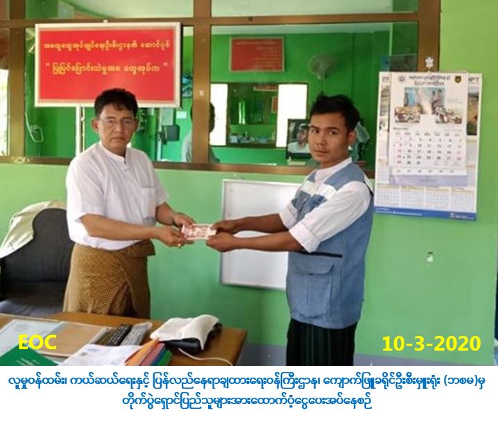 လူမှုဝန်ထမ်း၊ ကယ်ဆယ်ရေးနှင့် ပြန်လည်နေရာချထားရေးဝန်ကြီးဌာန၊ ဘေးအန္တရာယ်ဆိုင်ရာစီမံခန့်ခွဲမှုဦးစီး ဌာန၊ ကျောက်ဖြူခရိုင်ဦးစီးမှူးရုံးမှ တာဝန်ရှိသူများသည် (၂၂-၂-၂၀၂၀) ရက်နေ့ (၁၁း၀၀) နာရီအချိန်ခန့်တွင် ကျောက်ဖြူခရိုင်၊ အမ်းမြို့နယ်၊ ကဇုကိုင်းကျေးရွာအုပ်စု၊ ကဇုကိုင်းကျေးရွာသို့ ရောက်ရှိခိုလှုံနေသောတိုက် ပွဲရှောင် အိမ်ထောင်စု (၁၀)စု၊ ကျား(၂၂)ဦး၊ မ(၁၆)ဦး၊ ပေါင်း (၃၈) ဦးတို့အတွက် ဆန်ရိက္ခာ(၂)ပတ်စာ (၅)အိတ်၊ (၁၃)ပြည် တန်ဖိုးငွေ (၁၅၉,၆၀၀/-) ကျပ်အား (၂၅-၂-၂၀၂၀) ရက်နေ့တွင်ထောက်ပံ့ပေးအပ်ခဲ့ပြီး ယခုအခါတွင် တစ်လ ပြည့်ပြီးဖြစ်ပါသဖြင့် ဆန်ရိက္ခာ(၁)လစာ ( ၁၁) အိတ်၊(၂၁)ပြည် တန်ဖိုးငွေ (၃၄၂,၀၀၀/-)ကျပ်အား (၁၀-၃-၂၀၂၀) ရက်နေ့နေ့လည်(၁၃း၀၀)နာရီတွင် ကျောက်ဖြူခရိုင်ဦးစီးမှူးရုံးမှ အမ်းမြို့နယ်အထွေထွေ အုပ်ချုပ်ရေးဦး စီးဌာန၊ မြို့နယ်အုပ်ချုပ်ရေးမှူးထံသို့လွှဲပြောင်းထောက်ပံ့ ပေးအပ်ခဲ့ပြီးဖြစ်ပါကြောင်း သတင်းရရှိပါသည်။