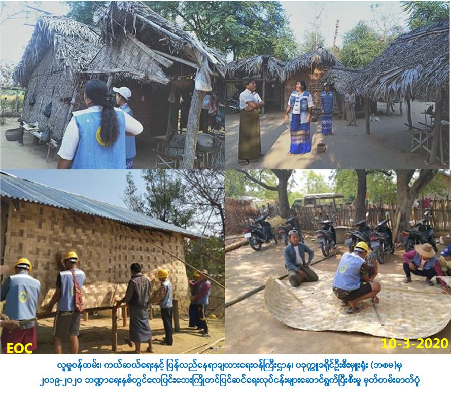 လူမှုဝန်ထမ်း၊ ကယ်ဆယ်ရေးနှင့် ပြန်လည်နေရာချထားရေးဝန်ကြီးဌာန၊ ဘေးအန္တရာယ်ဆိုင်ရာစီမံ ခန့်ခွဲမှုဦးစီးဌာန၊ ပခုက္ကူခရိုင်ဦးစီးမှူးရုံးမှ တာဝန်ရှိသူများသည် (၂၀၁၉-၂၀၂၀) ဘဏ္ဍာရေးနှစ်၊ လေပြင်းဘေးကြိုတင်ပြင်ဆင်ရေးလုပ်ငန်းအတွက် (၁-၃-၂၀၂၀) ရက်နေ့မှ (၁၀-၃-၂၀၂၀) ရက်နေ့အထိ၊ (၁၀)ရက်တာ၊ ပခုက္ကူမြို့နယ်၊ ကျတ်ထိုးကျေးရွာအုပ်စု၊ ရေလာကျေးရွာအုပ်စု၊ မန်ကျည်းသုံးပင်ကျေးရွာ အုပ်စု၊ ကမ္မမြို့၊ အမှတ်(၉)နှင့် အမှတ်(၁၂)ရပ်ကွက်တို့တွင် ပြင်ဆင်ရန်လိုအပ်သည့် နေအိမ်အလုံး(၂၀၀) အား ရပ်ကွက်/ကျေးရွာ သဘာဝဘေးအန္တရာယ်ဆိုင်ရာစီမံခန့်ခွဲမှုကော်မတီ၊ ကမ္ဘာမြေချစ်သူများအဖွဲ့ (CSO)၊ ကျေးရွာအုပ်ချုပ်ရေးမှူး၊ ကျေးရွာခွဲတာဝန်ခံ၊ ရပ်မိ/ရပ်ဖများနှင့်အတူ ဆောင်ရွက်ခဲ့ပြီးဖြစ်ပါ ကြောင်း သတင်းရရှိပါသည်။