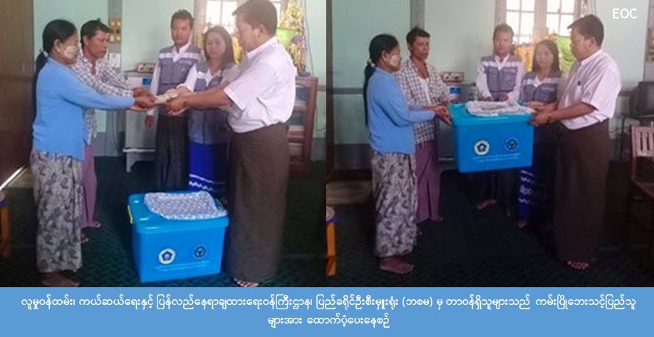 လူမှုဝန်ထမ်း၊ ကယ်ဆယ်ရေးနှင့် ပြန်လည်နေရာချထားရေးဝန်ကြီးဌာန၊ ဘေးအန္တရာယ်ဆိုင်ရာ စီမံခန့်ခွဲမှုဦးစီးဌာန၊ ပြည်ခရိုင်ဦးစီးမှူးရုံးမှ တာဝန်ရှိသူများသည် (၄-၃-၂၀၂၀)ရက်နေ့တွင် ပြည်ခရိုင်၊ ရွှေတောင်မြို့နယ်၊ ကျီးသဲကျေးရွာအုပ်စု၊ ကျီးသဲကျေးရွာတွင် ဖြစ်ပွားခဲ့သော မြစ် ကမ်းပါးပြိုကျမှုကြောင့် ပြောင်းရွေ့ခဲ့သော အိမ်ခြေ (၁) အိမ်အတွက် ကယ်ဆယ်ရေးပစ္စည်း (၁၀) မျိုး (ပလတ်စတစ်ပုံးပါ) (၁) ပုံး၊ အိမ်ဆောက်ပစ္စည်းဖိုးထောက်ပံ့ငွေ (၁၀၀,၀၀၀) ကျပ်နှင့် လူဉီးရေ (၂) ဉီး အတွက်ဆန်ရိက္ခာ(၇) ရက်စာ ဖိုးထောက်ပံ့ငွေ (၄,၂၀၀) ကျပ်၊ စုစုပေါင်း (၁၀၄၂,၀၀၀) ကျပ်အား (၁၀-၃-၂၀၂၀)ရက်နေ့ (၁၄:၀၀)အချိန်တွင် ဘေးသင့်ပြည်သူများ လက်ဝယ်အရောက်သွားရောက် ထောက်ပံ့ခဲ့ကြောင်း သိရှိရပါသည်။