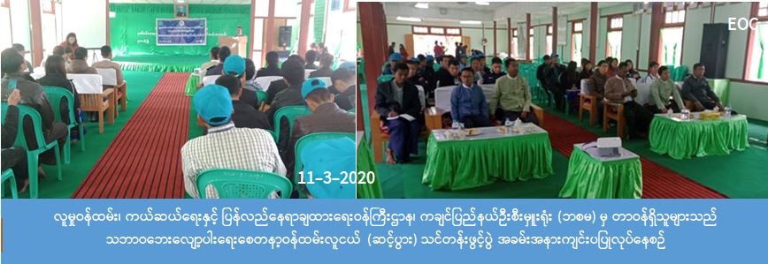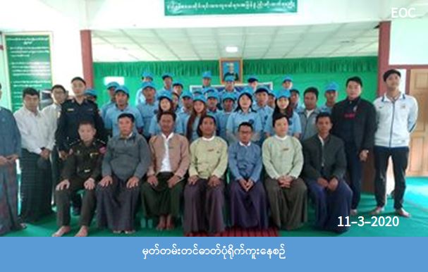 လူမှုဝန်ထမ်း၊ ကယ်ဆယ်ရေးနှင့် ပြန်လည်နေရာချထားရေးဝန်ကြီးဌာန၊ ဘေးအန္တရာယ်ဆိုင်ရာ စီမံခန့်ခွဲမှုဦးစီး ဌာန၊ ကချင်ပြည်နယ်ဦးစီးမှူးရုံးနှင့် ပူတာအိုခရိုင်ဦးစီးမှူးရုံးမှ တာဝန်ရှိသူများသည် သဘာဝဘေးလျော့ပါးရေး စေတနာ့ဝန်ထမ်းလူငယ် (ဆင့်ပွား) သင်တန်းဖွင့်ပွဲအခမ်းအနားကို ပူတာအိုမြို့ လူငယ်သင်တန်းကျောင်းခန်းမ ၌ (၁၁-၃-၂၀၂၀) ရက်နေ့ နံနက် (၉:၀၀)အချိန်တွင် ကျင်းပပြုလုပ် ခဲ့ပါသည်။ အဆိုပါ သင်တန်းဖွင့်ပွဲအခမ်း အနား၌ ပူတာအိုခရိုင် ဒုတိယအုပ်ချုပ်ရေးမှူးမှ အဖွင့်အမှာစကားပြောကြားခဲ့ပြီး ဘေးအန္တရာယ်ဆိုင်ရာ စီမံ ခန့်ခွဲမှုဦးစီးဌာန၊ ကချင်ပြည်နယ်ဦးစီးမှူးရုံးမှ တာဝန်ရှိသူတစ်ဦးမှ သင်တန်းဖွင့်လှစ်ရခြင်းနှင့် စပ်လျဉ်း၍ ရှင်းလင်းပြောကြားခဲ့ကာ သင်တန်းကို ဖွင့်လှစ်ခဲ့ပါသည်။ အဆိုပါသင်တန်းသို့ ဖိတ်ကြားထားသော ဌာနဆိုင်ရာ များ သင်တန်းသား/သူ (၃၀) ဦး၊ စုစုပေါင်း (၆၅) ဦးခန့် တက်ရောက်ခဲ့ကာ သင်တန်းကို (၁၁-၃-၂၀၂၀) ရက်နေ့မှ(၁၃-၃-၂၀၂၀) ရက်နေ့ထိ (၃) ရက်ကြာ ဖွင့်လှစ်ပို့ချသွားမည် ဖြစ်ကြောင်း သိရှိရပါသည်။