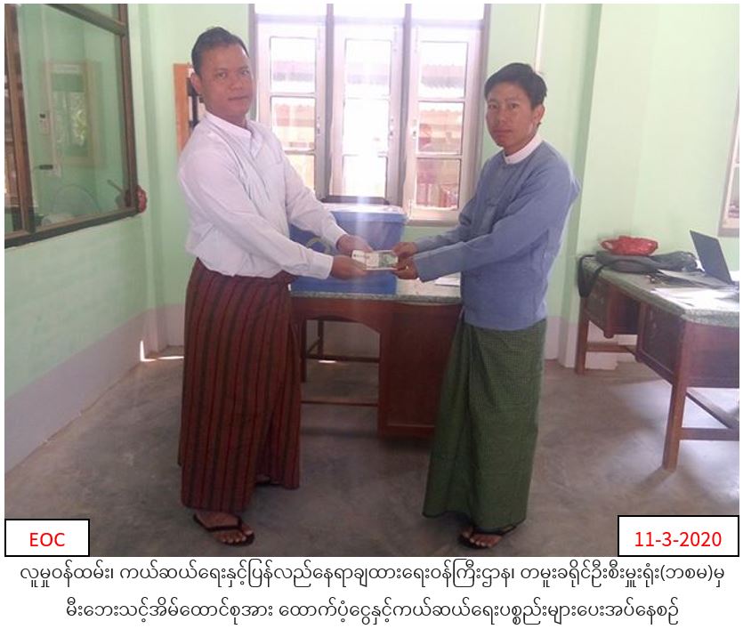 လူမှုဝန်ထမ်း၊ ကယ်ဆယ်ရေးနှင့်ပြန်လည်နေရာချထားရေးဝန်ကြီးဌာန၊ ဘေးအန္တရာယ်ဆိုင်ရာစီမံခန့်ခွဲမှုဦးစီးဌာန၊ တမူးခရိုင်ဦးစီးမှူးရုံးမှ တာဝန်ရှိသူသည်(၈-၃-၂၀၂၀)နေ့တွင် တမူးခရိုင်၊ ခမ်းပါတ်မြို့၊ ထင်းဇင်ကျေးရွာအုပ်စု၊ ကမ္မကြီးကျေးရွာတွင် မီးလောင်ဆုံးရှုံးခဲ့သည့် နေအိမ်(၁)လုံး အိမ်ထောင်စု(၁)စုအား ကယ်ဆယ်ရေးပစ္စည်း(၁၇)မျိုး အိမ်ဆောက်ပစ္စည်းဖိုး (၁၀၀၀၀၀ိ/-)နှင့် ဆန်ရိက္ခာဖိုးထောက်ပံ့ငွေ (၁၀၅၀၀ိ/-) တိတိအား (၁၁-၃-၂၀၂၀)ရက်နေ့ (၁၁:၀၀) အချိန်တွင် မြို့နယ် ထွေ/အုပ် ဦးစီးဌာနမှ တစ်ဆင့် ထောက်ပံ့ပေးအပ်ခဲ့ကြောင်း သတင်းရရှိပါသည်။