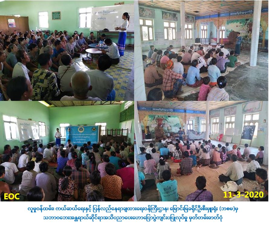 လူမှုဝန်ထမ်း၊ ကယ်ဆယ်ရေးနှင့် ပြန်လည်နေရာချထားရေး၀န်ကြီးဌာန၊ ဘေးအန္တရာယ်ဆိုင်ရာစီမံ ခန့်ခွဲမှုဦးစီးဌာန၊ မြောင်းမြခရိုင်ဦးစီးမှူးရုံးမှ တာဝန်ရှိသူများသည် (၁၁-၃-၂၀၂၀) ရက်နေ့၊ (၁၂:၀၀)နာရီမှ (၁၃း၀၀)နာရီ အချိန်အထိ မြောင်းမြခရိုင်၊ ဝါးခယ်မမြို့နယ်၊ သဲကုန်းကျေးရွာအုပ်စု၊ ငှက်ပျောစုကျးရွာတွင် ကျေးရွာသူ/ကျေးရွာသား (၁၀၀) ဦးတို့အား သဘာဝဘေးအန္တရာယ်နှင့်ဆိုင်သော အသိပညာပေး ဟောပြောခြင်းများ ဆောင်ရွက်ခဲ့ပြီး သဘာဝဘေးအသိပညာပေးလက်ကမ်းစာစောင်များနှင့် ခေါက်ဆွဲ ခြောက်ထုပ်များ ပေးအပ်ခဲ့ပါကြောင်း သတင်းရရှိပါသည်။