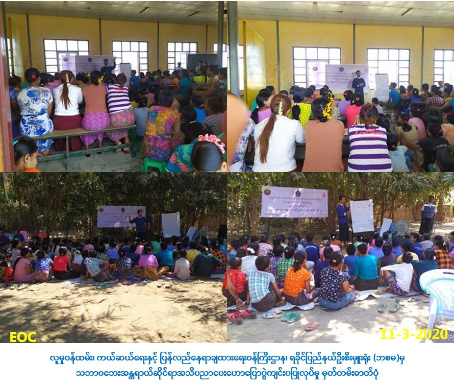 လူမှုဝန်ထမ်းကယ်ဆယ်ရေးနှင့် ပြည်လည်နေရာချထားရေးဝန်ကြီးဌာန၊ ဘေးအန္တရာယ်ဆိုင်ရာစီမံ ခန့်ခွဲမှုဦးစီးဌာန၊ ရခိုင်ပြည်နယ်ဦးစီးမှူးရုံးမှ တာဝန်ရှိသူများသည် (၁၁-၃-၂၀၂၀)ရက်နေ့၊ စစ်တွေမြို့နယ်၊ သင်္ဂနက်ကျေးရွာအုပ်စု၊ သာယာကုန်း ကျေးရွာ(ကမန်)တွင် ကျေးရွားသူ/သား (၁၄၀)ဦးတို့အား နံနက်ပိုင်း တွင်လည်းကောင်း၊ သင်္ဂနက်ကျေးရွာ(ကမန်)တွင် ကျေးရွာသူ/သား (၁၅၀)ဦးတို့အား နေ့လည်ပိုင်းတွင် လည်းကောင်း သဘာဝဘေးလျော့ပါးရေးအသိပညာပေးဟောပြောခြင်း၊ လက်ကမ်းစာဆောင်များ ဝေငှခြင်း၊ ခေါက်ဆွဲခြောက်ထုပ်နှင့် ကော်ဖီမစ်ထုတ်များဝေငှပေးခြင်းများ ပြုလုပ်ဆောင်ရွက်ခဲ့ပါကြောင်း သတင်းရရှိပါသည်။