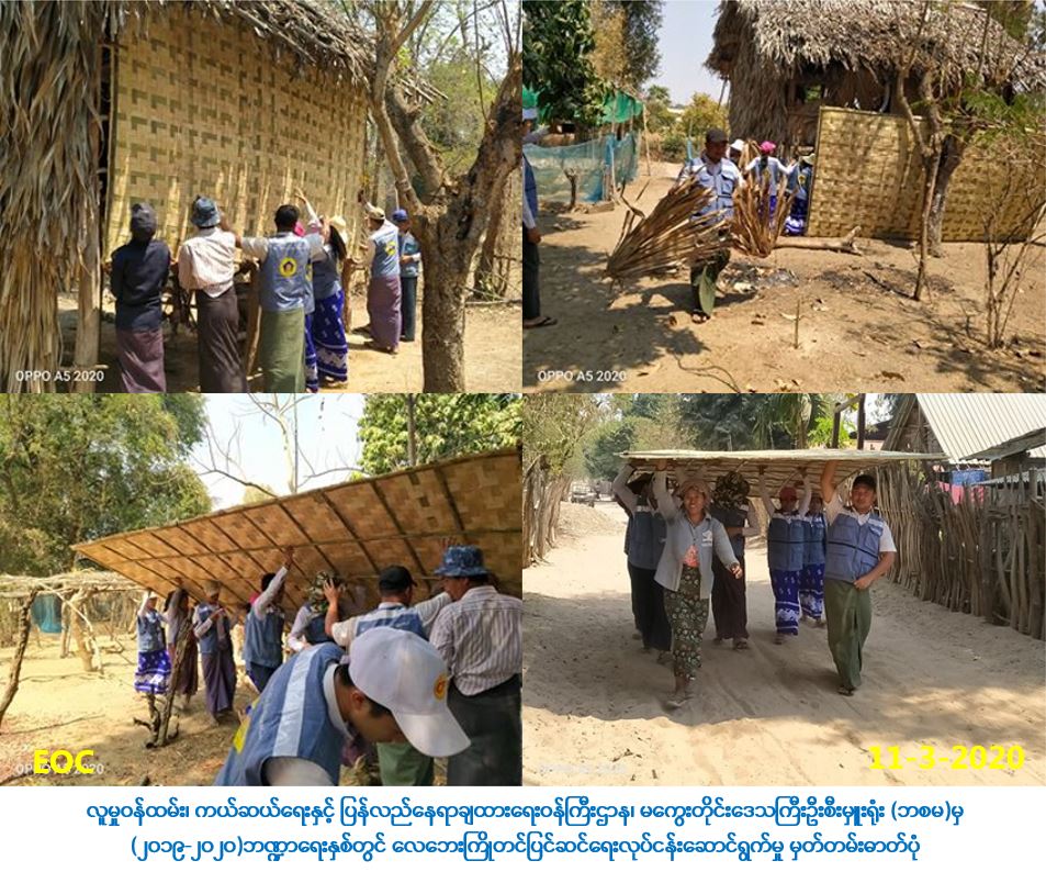 လူမှုဝန်ထမ်း၊ ကယ်ဆယ်ရေးနှင့် ပြန်လည်နေရာချထားရေးဝန်ကြီးဌာန၊ ဘေးအန္တရာယ်ဆိုင်ရာစီမံ ခန့်ခွဲမှုဦးစီးဌာန၊ မကွေးတိုင်းဒေသကြီးဦးစီးမှူးရုံးမှ တာဝန်ရှိသူများသည် (၁၁-၃-၂၀၂၀) ရက်နေ့၊ (၀၉:၃၀) နာရီမှ (၁၆:၀၀) နာရီအချိန်အထိ (၂၀၁၉-၂၀၂၀) ဘဏ္ဍာရေးနှစ်တွင် လေဘေးကြိုတင်ပြင်ဆင် ရေး လုပ်ငန်းဆောင်ရွက်မည့် နေအိမ် (၂၀၀) လုံးအနက် မကွေးမြို့နယ်၊ ကြည်တစ်လုံးကျေးရွာနှင့် လိပ်ကန်ကျေးရွာတို့၌ ပြင်ဆင်ရန်လိုအပ်သည့်နေအိမ်အလုံး (၃၀) အား လေဘေးကြိုတင်ပြင်ဆင်ရေး လုပ်ငန်းများဆောင်ရွက်ခဲ့ပါကြောင်း သတင်းရရှိပါသည်။
