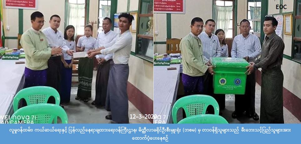 လူမှုဝန်ထမ်း၊ ကယ်ဆယ်ရေးနှင့် ပြန်လည်နေရာချထားရေးဝန်ကြီးဌာန၊ ဘေးအန္တရာယ်ဆိုင်ရာစီမံခန့်ခွဲမှုဦးစီးဌာန၊ မိတ္ထီလာခရိုင်ဦးစီးမှူးရုံးမှတာဝန်ရှိသူများသည် မလှိုင်မြို့၊ကျောက်တန်းကျေးရွာအုပ်စု၊ကျောက်တန်းကျေးရွာတွင် (၉-၃-၂၀၂၀) ရက်နေ့၌ မီးဘေးဖြစ်ပွားခဲ့ရာ မီးဘေးသင့်တစိတ်တစ်ပိုင်း အိမ်ခြေ (၃)လုံးမှ အိမ်ဆောက်ပစ္စည်းဖိုးငွေ (၁၆၀,၀၀၀) ကျပ်၊ ဆန်ဖိုးငွေ လူ (၁၃) ဦးအတွက်(၂၇,၃၀၀)ကျပ်၊ ကယ်ဆယ်ရေးပစ္စည်း (၁၀) မျိုး၊ (၃) အိမ်ထောင်စာ တို့ကို (၁၂-၃-၂၀၂၀) ရက်နေ့တွင် မီးဘေးသင့်ပြည်သူများလက်ဝယ်သို့ ထောက်ပံ့ပေးခဲ့ကြောင်း သိရှိရပါသည်။
