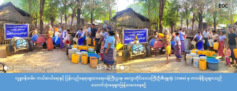 လူမှုဝန်ထမ်း၊ ကယ်ဆယ်ရေးနှင့်ပြန်လည်နေရာချထားရေး၀န်ကြီးဌာန၊ ဘေးအန္တရာယ်ဆိုင်ရာစီမံခန့်ခွဲမှုဦးစီးဌာန၊ မကွေးတိုင်းဒေသကြီးဦးစီးမှူးရုံးမှ တာဝန်ရှိသူများသည် သောက်သုံးရေခက်ခဲသော မကွေးမြို့နယ်၊ ကြာကန်ကျေးရွာ အုပ်စု၊ ကြာကန်ကျေးရွာ(ကွက်သစ်ပိုင်း)၊ ချောင်းဆင်း(တဲတိုက်)၊ ဉီးဝင်းကြည်(တဲတိုက်)ရှိ အိမ်ခြေ (၁၀၃) လုံး၊ အိမ်ထောင် စု (၁၂၂) စု၊ လူဦးရေ (၅၂၃) ဦးတို့အတွက် သောက်သုံးရေဂါလံ (၆,၀၀၀) အား ( ၁၂- ၃-၂၀၂၀) ရက်နေ့ ( ၁၁ : ၃၀ ) နာရီအချိန်တွင် သွားရောက်ဖြန့်ဝေပေးခဲ့ကြောင်း သိရှိရပါသည်။