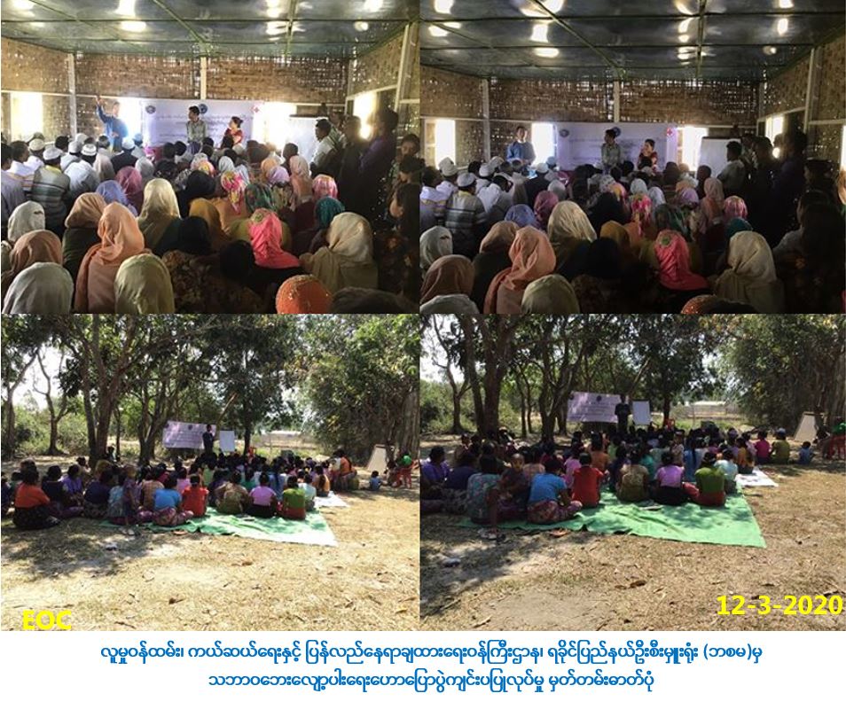 လူမှုဝန်ထမ်းကယ်ဆယ်ရေးနှင့် ပြည်လည်နေရာချထားရေးဝန်ကြီးဌာန၊ ဘေးအန္တရာယ်ဆိုင်ရာစီမံ ခန့်ခွဲမှုဦးစီးဌာန၊ ရခိုင်ပြည်နယ်ဦးစီးမှူးရုံးမှ တာဝန်ရှိသူများသည် (၁၂-၃-၂၀၂၀)ရက်နေ့တွင် စစ်တွေမြို့နယ်၊ သက္ကေပြင်ရွာမကျေးရွာ(ကမန်)တွင် ကျေးရွားသူ/သား (၁၂၀)ဦးတို့အား နံနက်ပိုင်းတွင် လည်းကောင်း၊ ငပွန်းကြီးကျေးရွာ(ဘင်္ဂါလီ)တွင် ကျေးရွာသူ/သား (၁၅၀)ဦးတို့အား နေ့လည်ပိုင်းတွင် လည်းကောင်း၊ သဘာဝဘေးလျော့ပါးရေးအသိပညာပေးဟောပြောခြင်း၊ လက်ကမ်းစာဆောင်များ ဝေငှခြင်း ယမ်ယမ်ခေါက်ဆွဲထုပ်နှင့် ကော်ဖီမစ်ထုတ်များ ဝေငှခြင်းများပြုလုပ်ဆောင်ရွက်ခဲ့ပါကြောင်း သတင်းရရှိပါသည်။