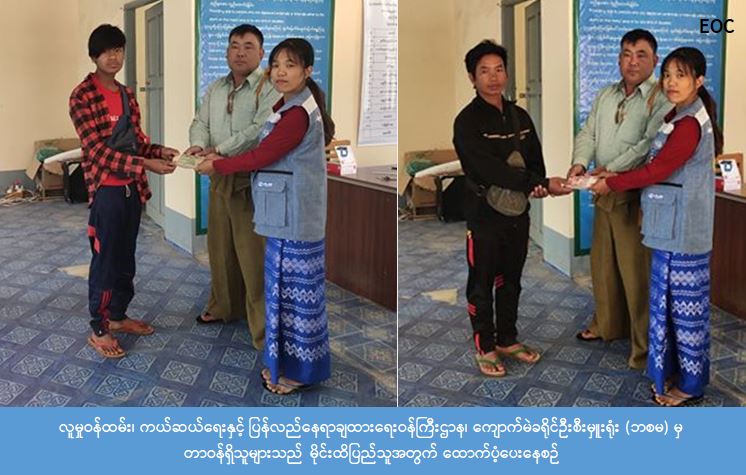 လူမှုဝန်ထမ်း၊ ကယ်ဆယ်ရေးနှင့် ပြန်လည်နေရာချထားရေးဝန်ကြီးဌာန၊ ဘေးအန္တရာယ်ဆိုင်ရာစီမံခန့်ခွဲမှုဦးစီးဌာန၊ ကျောက်မဲခရိုင်ဦးစီးမှူးရုံးမှ တာဝန်ရှိသူများသည် (၁၀-၃-၂၀၂၀)ရက်နေ့၌ ကျောက်မဲမြို့နယ်၊ စခန်းသာကျေးရွာအုပ်စု၊ ခမ်းဆာကျေးရွာအနီးတွင် မိုင်းနင်းမိ၍ သေဆုံးသူ(၂)ဦးအတွက် ထောက်ပံ့ငွေ (၆၀၀,၀၀ဝ)ကျပ်အား (၁၂-၃-၂၀၂၀) ရက်နေ့(၁၂:၀၀)နာရီအချိန်တွင် ကျန်ရစ်သူ မိသားစုဝင်များလက်၀ယ်အရောက်ထောက်ပံ့ခဲ့ကြောင်း သိရှိရပါသည်။