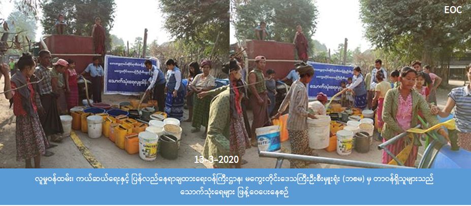 လူမှုဝန်ထမ်း၊ ကယ်ဆယ်ရေးနှင့်ပြန်လည်နေရာချထားရေးဝန်ကြီးဌာန၊ ဘေးအန္တရာယ်ဆိုင်ရာစီမံခန့်ခွဲမှုဦးစီးဌာန၊ မကွေးတိုင်းဒေသကြီး ဦးစီးမှူးရုံးမှ တာဝန်ရှိသူများသည် သောက်သုံးရေခက်ခဲသော မကွေးမြို့နယ်၊ ကြာကန် ကျေးရွာအုပ်စု၊ ကြာကန်ကျေးရွာ(အရှေ့ပိုင်း)၊ ဉီးလှိုင်(တဲတိုက်)၊ ဉီးဝိုင်းမောင်(တဲတိုက်)ရှိ အိမ်ခြေ (၁၃၇) လုံး၊ အိမ်ထောင်စု (၁၄၈) စု၊ လူဦးရေ (၇၀၃) ဦးတို့အတွက် သောက်သုံးရေဂါလံ (၆၀၀၀) အား ( ၁၃- ၃-၂၀၂၀) ရက် နေ့ ( ၁၁ : ၃၀) နာရီအချိန်တွင် သွားရောက်ဖြန့်ဝေပေးခဲ့ကြောင်း သတင်းရရှိပါသည်။