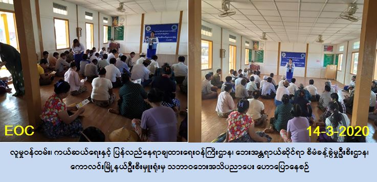 လူမှုဝန်ထမ်း၊ ကယ်ဆယ်ရေးနှင့် ပြန်လည်နေရာချထားရေးဝန်ကြီးဌာန၊ ဘေးအန္တရာယ်ဆိုင်ရာ စီမံခန့်ခွဲမှုဦးစီးဌာန၊ ကောလင်းမြို့နယ်ဦးစီးမှူးရုံးမှ တာဝန်ရှိသူများသည် (၁၄-၃-၂၀၂၀) ရက်နေ့၊ နံနက် ( ၉ : ၃၀ ) အချိန်တွင် ပင်လည်ဘူးမြို့နယ်၊ မိုးကောင်းရပ်ကွက်တွင် ရွာသူ ရွာသားပေါင်း (၅၅) ဦးအား သဘာဝဘေးအန္တရာယ် လျော့ပါးရေးဆိုင်ရာ အသိပညာပေး ဟော ပြောပွဲပြုလုပ်ခဲ့ကြောင်းသတင်းရရှိပါသည်။