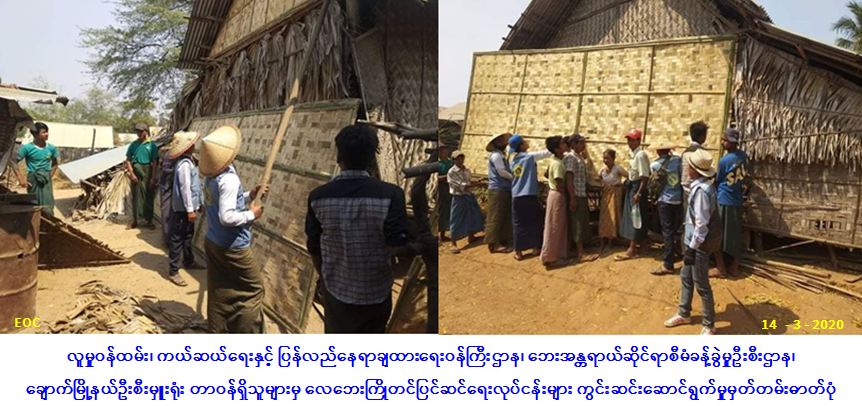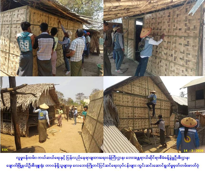 လူမှုဝန်ထမ်း၊ ကယ်ဆယ်ရေးနှင့်ပြန်လည်နေရာချထားရေးဝန်ကြီးဌာန၊ ဘေးအန္တရာယ်ဆိုင်ရာစီမံ ခန့်ခွဲမှုဦးစီးဌာန၊ ချောက်မြို့နယ်ဦးစီးမှူးရုံးမှ တာဝန်ရှိသူများသည် (၁၄-၃-၂၀၂၀) ရက်နေ့၊ (၀၉:၃၀) နာရီမှ (၁၅:၀၀) နာရီအချိန်အထိ (၂၀၁၉-၂၀၂၀) ဘဏ္ဍာရေးနှစ်တွင် လေဘေးကြိုတင်ပြင်ဆင်ရေး လုပ်ငန်းဆောင်ရွက်မည့် နေအိမ် (၂၀၀) လုံးအနက် ချောက်မြို့နယ်၊ ရွာမအုပ်စု-ရွာမကျေးရွာတွင် ပြင်ဆင်ရန်လိုအပ်သည့်နေအိမ် (၁၇၁) လုံးအား လေဘေးကြိုတင်ပြင်ဆင်ရေးလုပ်ငန်းများ ကွင်းဆင်း ဆောင်ရွက်ခဲ့ပါကြောင်း သတင်းရရှိပါသည်။