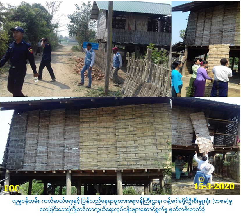 လူမှုဝန်ထမ်း၊ ကယ်ဆယ်ရေးနှင့်ပြန်လည်နေရာချထားရေးဝန်ကြီးဌာန၊ ဘေးအန္တရာယ်ဆိုင်ရာစီမံ ခန့်ခဲမှုဦးစီးဌာန၊ ဂန့်ဂေါခရိုင်ဦးစီးမှူးရုံးမှ တာဝန်ရှိသူများသည် (၁၅-၃-၂၀၂၀)ရက်နေ့၊ (၀၉:၀၀) နာရီအချိန်မှ (၁၆:၀၀)နာရီအချိန်ထိ ကွမ်းဇဲကျေးရွာတွင် လေပြင်းဘေးကြိုတင်ကာကွယ်ရေး နေအိမ်များအားဖြည့်ပြုပြင်ခြင်းအား မြို့နယ်အဆင့်သဘာဝဘေးစီမံခန့်ခွဲမှုကော်မတီ၊ မိခင်နှင့် ကလေးစောင့်ရှောက်ရေး၊ အမျိုးသမီးရေးရာအဖွဲ့၊ ကျေးရွာအုပ်ချုပ်ရေးမှူး၊ ကျေးရွာပြည်သူလူထု တို့နှင့် ပူးပေါင်းဆောင်ရွက်ခဲ့ပါကြောင်း သတင်းရရှိပါသည်။