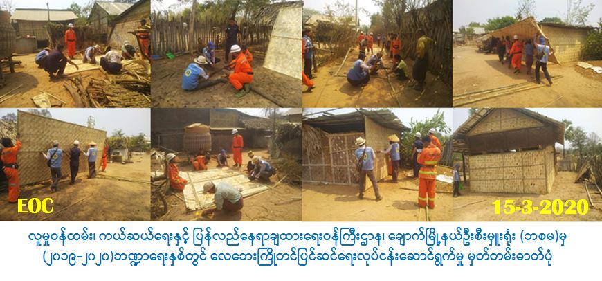 လူမှုဝန်ထမ်း၊ ကယ်ဆယ်ရေးနှင့်ပြန်လည်နေရာချထားရေးဝန်ကြီးဌာန၊ ဘေးအန္တရာယ်ဆိုင်ရာစီမံ ခန့်ခွဲမှုဦးစီးဌာန၊ ချောက်မြို့နယ်ဦးစီးမှူးရုံးမှ တာဝန်ရှိသူများသည် (၁၅-၃-၂၀၂၀) ရက်နေ့၊ (၀၉:၃၀) နာရီမှ (၁၅:၀၀) နာရီအချိန်အထိ (၂၀၁၉-၂၀၂၀) ဘဏ္ဍာရေးနှစ်တွင် လေဘေးကြိုတင်ပြင်ဆင်ရေး လုပ်ငန်းဆောင်ရွက်မည့် နေအိမ်အလုံး (၂၀၀) အနက် ချောက်မြို့နယ်၊ ရွာမအုပ်စု-ရွာမကျေးရွာတွင် ပြင်ဆင်ရန်လိုအပ်သည့် နေအိမ် (၁၇၁) လုံးအား လေဘေးကြိုတင်ပြင်ဆင်ရေးလုပ်ငန်းများ ဆောင်ရွက်ခဲ့ပါကြောင်း သတင်းရရှိပါသည်။