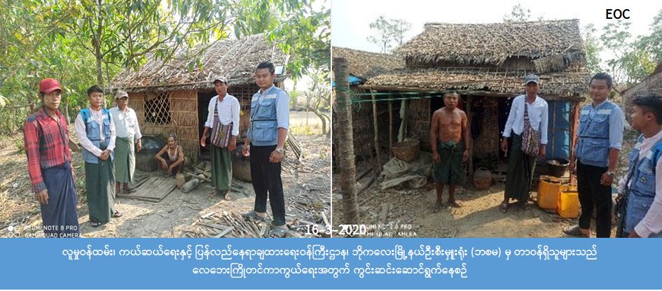 လူမှုဝန်ထမ်း၊ ကယ်ဆယ်ရေးနှင့် ပြန်လည်နေရာချထားရေးဝန်ကြီးဌာန၊ ဘေးအန္တရာယ်ဆိုင်ရာစီမံခန့်ခွဲမှုဉီးစီးဌာန၊ ဘိုကလေးမြို့နယ်ဉီးစီးမှူးရုံးမှ တာဝန်ရှိသူများသည် (၁၆-၃-၂၀၂၀) ရက်နေ့တွင် ဧရာဝတီတိုင်းဒေသကြီး၊ ဘိုကလေးမြို့နယ်၊ ခနောင်ကျေးရွာအုပ်စု၊ ခနောင်ကျေးရွာတွင် လေပြင်းဘေးကြိုတင်ကာကွယ်ရေးအတွက် နေအိမ်များအား ဖြည့်စွက်ပြင်ဆင်ခြင်းလုပ်နိုင်ရန်အတွက် အထွေထွေအုပ်ချုပ်ရေးဉီးစီးဌာနမှတာဝန်ရှိသူများ၊ ရပ်မိရပ်ဖများနှင့်အတူ ကွင်းဆင်းဆောင်ရွက်ခဲ့ကြောင်း သိရှိရပါသည်။