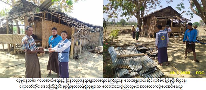လူမှုဝန်ထမ်း၊ ကယ်ဆယ်ရေးနှင့် ပြန်လည်နေရာချထားရေးဝန်ကြီးဌာန၊ ဘေးအန္တရာယ်ဆိုင်ရာစီမံခန့်ခွဲမှုဦးစီး ဌာန၊ ဧရာဝတီတိုင်းဒေသကြီးဦးစီးမှူးရုံးမှတာဝန်ရှိသူများသည် ပုသိမ်ခရိုင်၊ ကျုံပျော်မြို့နယ်၊ ကျူတောကျေးရွာအုပ်စု၊ ပိန်းအင်းကုန်းကျေးရွာ၌ (၁၇-၃-၂၀၂၀) ရက်နေ့တွင် ဖြစ်ပွားခဲ့သော လေဘေးကြောင့် အမိုးလန်ပျက်စီးနေအိမ် (၁)လုံး၊ အိမ်ထောင်စု (၁)စုမှ လူဦးရေ (၇)ဦးဘေးသင့်ခဲ့ရာ အဆိုပါ ဘေးသင့်ပြည်သူများအတွက် အိမ်ဆောက်ပစ္စည်းဖိုးထောက်ပံ့ငွေ (၅၀,၀၀ဝ/-) ကျပ်၊ ဆန်ရိက္ခာ(၇)ရက်စာ ဖိုးထောက်ပံ့ငွေ (၁၄,၇၀ဝ/-) ကျပ်တို့ကို (၁၈-၃-၂၀၂၀)ရက်နေ့၊ (၁၁:၃၀)နာရီအချိန်တွင် တာဝန်ရှိသူများနှင့်အတူ ပြည်သူ့လက်ဝယ်အရောက် ထောက်ပံ့ပေးအပ်ခဲ့ပါကြောင်း သတင်းရရှိပါသည်။