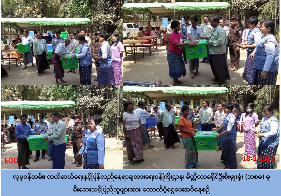 လူမှုဝန်ထမ်း၊ ကယ်ဆယ်ရေးနှင့် ပြန်လည်နေရာချထားရေးဝန်ကြီးဌာန၊ ဘေးအန္တရာယ်ဆိုင်ရာ စီမံခန့်ခွဲမှုဦးစီးဌာန၊ မိတ္ထီလာခရိုင်ဦးစီးမှူးရုံးမှ တာဝန်ရှိသူများသည် (၁၇-၃-၂၀၂၀) ရက်နေ့တွင် မိတ္ထီလာမြို့အောင်ဇေယျာရပ်ကွက်၊ နယ်မြေ(၈)၊ စိန်ပန်းလမ်း၌ မီးဘေးဖြစ်ပွားခဲ့ရာ မီးဘေးသင့် အိမ်ခြေ(၁၃)လုံးအတွက် အိမ်ဆောက်ပစ္စည်းဖိုးထောက်ပံ့ ငွေ(၁,၅၀၀,၀၀၀) ကျပ်၊ လူဦးရေ(၉၉) ဦးအတွက်ဆန်ဖိုးထောက်ပံ့ငွေ(၂၀၇,၉၀၀) ကျပ်၊ လုံးဝပျက်စီးအိမ်မှ အိမ်ထောင်စု (၁၅)စု အတွက် ကယ်ဆယ်ရေးပစ္စည်း(၁၈)မျိုး၊ (၁၅) အိမ်ထောင်စုစာ၊ တစ်စိတ်တစ်ပိုင်းပျက် အိမ် ထောင်စု(၂) အိမ်အတွက်ကယ်ဆယ်ရေးပစ္စည်း (၂)အိမ် ထောင်စုစာတို့ကို မီးဘေးကယ်ဆယ် ရေးစခန်းဖွင့်လှစ်ထားသည့်(အ.မ.က) (၁၉) စာသင်ကျောင်းရှိ မီးဘေးသင့်ပြည်သူများ လက်ဝယ် သို့ (၁၈-၃-၂၀၂၀) ရက်နေ့တွင် သွားရောက်ထောက်ပံ့ခဲ့ပါကြောင်း သတင်းရရှိပါသည်။