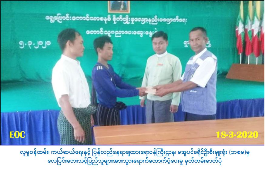 လူမှုဝန်ထမ်း၊ ကယ်ဆယ်ရေးနှင့် ပြန်လည်နေရာချထားရေးဝန်ကြီးဌာန၊ဘေးအန္တရာယ်ဆိုင်ရာစီမံ ခန့်ခွဲမှုဦးစီးဌာန၊ ကယားပြည်နယ်ဦးစီးမှူးရုံးမှ တာဝန်ရှိသူများသည်(၁၆-၃-၂၀၂၀)ရက်နေ့တွင် ကယားပြည်နယ်၊ လွိုင်ကော်ခရိုင်၊ ရှားတောမြို့နယ်၊ မြောက်ပိုင်းကျေးရွာအုပ်စု၊ တေလဲကျေးရွာ၌ ရုတ်တရက်လေပြင်းတိုက်ခတ်မှုကြောင့် သွပ်မိုး၊ ထရံကာ၊ ပျဉ်ခင်း နေအိမ်(၁)လုံး အမိုးလန် ပျက်စီးခဲ့ရာ အိမ်ထောင်စု(၁)စု၊ လူဦးရေ(၃)ဦးအတွက် အိမ်ဆောက်ပစ္စည်းဖိုးထောက်ပံ့ငွေ (၉၀,၀၀ဝ)ကျပ်နှင့် ဆန်ရိက္ခာဖိုးထောက်ပံ့ငွေ (၇)ရက်စာ (၆,၃၀ဝ)ကျပ်၊ ရန်ပုံငွေစုစုပေါင်း (၉၆,၃၀ဝ)ကျပ်ကို (၁၈-၃-၂၀၂၀) ရက်နေ့တွင် သွားရောက်ထောက်ပံ့ခဲ့ပါကြောင်း သတင်းရရှိ ပါသည်။