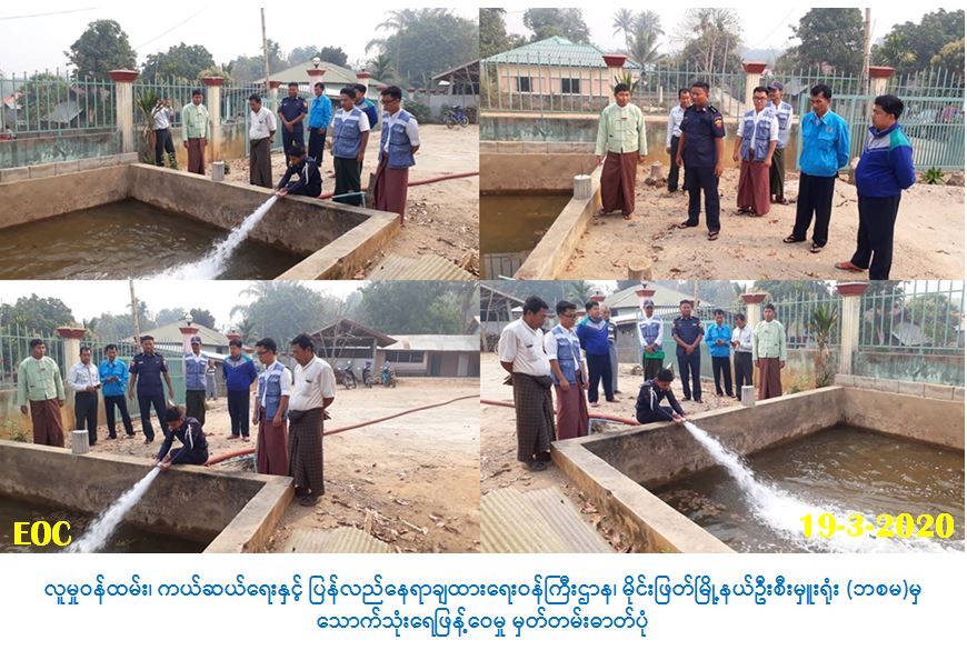 ခန့်ခွဲမှုဦးစီးဌာန၊ မိုင်းဖြတ်မြို့နယ်ဦးစီးမှူးရုံးမှ တာဝန်ရှိသူများသည် (၁၉-၃-၂၀၂၀) ရက်နေ့၊ နံနက် (၉:၀၀)နာရီအချိန်တွင် မိုင်းဖြတ်မြို့နယ်၊ ဝမ်လုံးအုပ်စု၊ နားမွန်းကျေးရွာတွင် သောက်သုံးရေ ဂါလန် (၁၂၀၀) အား မြို့နယ်ထွေအုပ်၊ မြို့နယ်စည်ပင်၊ မြို့နယ်မီးသတ်တပ်ဖွဲ့၊ မြို့နယ်လျှပ်စစ်ဌာနတို့နှင့် အတူ သွားရောက်ဖြန့်ဝေခဲ့ပါကြောင်း သတင်းရရှိပါသည်။