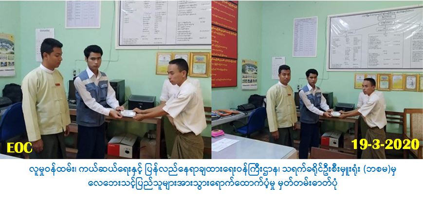 လူမှုဝန်ထမ်း၊ ကယ်ဆယ်ရေးနှင့်ပြန်လည်နေရာချထားရေးဝန်ကြီးဌာန၊ ဘေးအန္တရာယ်ဆိုင်ရာစီမံ ခန့်ခဲမှုဦးစီးဌာန၊ သရက်ခရိုင်ဦးစီးမှူးရုံးမှ တာဝန်ရှိသူများသည် (၁၈-၃-၂၀၂၀)ရက်နေ့၊ (၁၃:၅၀) နာရီအချိန်တွင် သရက်ခရိုင်၊ သရက်မြို့နယ်၊ ထီးရိုးကျေးရွာအုပ်စု၊ ထီးရိုးကျေးရွာ၌ လေပြင်းတိုက်ခတ်မှုကြောင့် လူနေအိမ်(၁)လုံး အမိုးလန်ပျက်စီးခဲ့ပြီး အိမ်ထောင်စု(၁)စု၊ လူဦးရေ (၅)ဦး လေဘေးသင့်ခဲ့ရာ လေဘေးသင့် အိမ်ထောင်စု(၁)စု၊ လူဦးရေ(၅)ဦးတို့အတွက် ဆန်ရိက္ခာဖိုး (၇) ရက်စာ (၁၀,၅၀ဝ)ကျပ်၊ အိမ်ဆောက်ပစ္စည်းဖိုးထောက်ပံ့ငွေ (၃၀,၀၀ဝ)ကျပ် ရန်ပုံငွေ စုစုပေါင်း (၄၀,၅၀ဝ)ကျပ်အား (၁၉-၃-၂၀၂၀) ရက်နေ့၊ နံနက် (၁၁:၀၀) နာရီအချိန်တွင် သရက်မြို့နယ်၊ အထွေထွေအုပ်ချုပ်ရေးဦးစီးဌာနမှ တာဝန်ရှိသူများရှေ့မှောက်တွင် ဘေးသင့်ပြည်သူများထံ လက်ဝယ်အရောက် ထောက်ပံ့ပေးအပ်ခဲ့ပါကြောင်း သတင်းရရှိပါသည်။