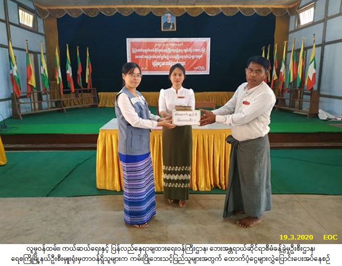 အိမ်ထောင်စု (၁၀) စု လူဦးရေ (၃၃) ဦးတို့အတွက် အိမ်ဆောက်ပစ္စည်းဖိုးထောက်ပံ့ငွေ (၆၀၀,၀၀၀/-) ကျပ်နှင့် ဆန်ရိက္ခာဖိုးထောက်ပံ့ငွေ (၆၉,၃၀၀/-) ကျပ်တို့ကို (၁၉-၃-၂၀၂၀) ရက်နေ့၊ (၁၅:၃၀)နာရီအချိန်တွင် မြို့နယ် အထွေထွေအုပ်ချုပ်ရေးဦးစီးဌာနအစည်းအဝေးခန်းမ၌ ဘေးသင့်ပြည်သူများအတွက် နွယ်နီကျေးရွာ အုပ်ချုပ်ရေးမှူးထံသို့ လွှဲပြောင်းပေးအပ်ထောက်ပံ့ခဲ့ပါကြောင်း သတင်းရရှိပါသည်။