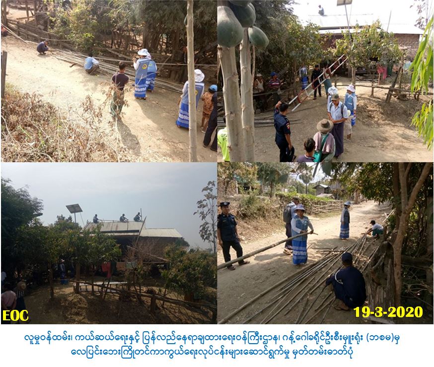 လူမှုဝန်ထမ်း၊ ကယ်ဆယ်ရေးနှင့်ပြန်လည်နေရာချထားရေးဝန်ကြီးဌာန၊ ဘေးအန္တရာယ်ဆိုင်ရာစီမံ ခန့့်ခွဲမှုဦးစီးဌာန၊ ဂန့်ဂေါခရိုင်ဦးစီးမှူးရုံးမှ တာဝန်ရှိသူများသည် (၁၉-၃-၂၀၂၀)ရက်နေ့၊ (၀၉:၀၀) နာရီအချိန်မှ (၁၆:၀၀)နာရီအချိန်ထိ လယ်ကြီးကျေးရွာအုပ်စု၊ ဝင်ဝကျေးရွာတွင် မြို့နယ်အဆင့် သဘာဝကာကွယ်ရေးနေအိမ်များ အားဖြည့်ပြုပြင်ခြင်းကို မြို့နယ်အဆင့်သဘာဝဘေးစီမံခန့်ခွဲမှု ကော်မတီ၊ ကျေးရွာအုပ်ချုပ်ရေးမှူး၊ ကျေးရွာပြည်သူလူထုတို့နှင့် ပူးပေါင်းဆောင်ရွက်ခဲ့ပါကြောင်း သတင်းရရှိပါသည်။