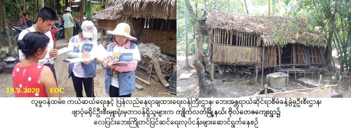 လူမှုဝန်ထမ်း၊ ကယ်ဆယ်ရေးနှင့် ပြန်လည်နေရာချထားရေးဝန်ကြီးဌာန၊ ဘေးအန္တရာယ်ဆိုင်ရာစီမံခန့်ခွဲမှုဦးစီး ဌာန၊ ဖျာပုံခရိုင်ဦးစီးမှူးရုံးမှတာဝန်ရှိသူများသည် (၁၉-၃-၂၀၂၀)ရက်နေ့တွင် ဒေးဒရဲမြို့နယ်၊ သံဒိသဲကုန်းလေးကျေးရွာအုပ်စုအတွင်းရှိ သဲကုန်းလေးကျေးရွာ၌လည်းကောင်း၊ ကျိုက်လတ်မြို့နယ်၊ ကြံခင်းစုကျေးရွာ အုပ်စုအတွင်းရှိ ဗိုလ်တေဇကျေးရွာ၌လည်းကောင်း အထွေထွေအုပ်ချုပ်ရေးဦးစီးဌာနမှ ကျေးရွာအုပ်အုပ်ချုပ် ရေးမှူး၊ ကျေးရွာအုပ်စု သဘာဝဘေးအန္တရာယ်ဆိုင်ရာစီမံခန့်ခွဲမှုကော်မတီဝင်များ၊ ရပ်မိ/ရပ်ဖများ၊ ကျေးရွာပြည်သူများနှင့် တွေ့ဆုံ၍ လေပြင်းဘေးကြိုတင်ပြင်ဆင်ရေးညှိနှိုင်းခြင်း၊ မွမ်းမံပြင်ဆင်ရန်လိုအပ်သည့် နေအိမ်များအား ကွင်းဆင်းစာရင်းကောက်ယူခြင်းတို့ဆောင်ရွက်ခဲ့ပါကြောင်း သတင်းရရှိပါသည်။
