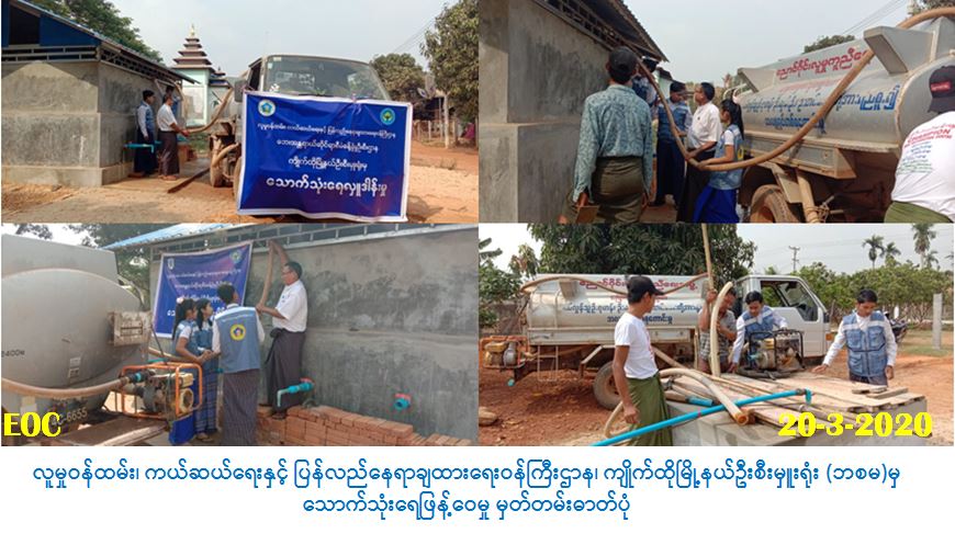 လူမှုဝန်ထမ်း၊ ကယ်ဆယ်ရေးနှင့် ပြန်လည်နေရာချထားရေးဝန်ကြီးဌာန၊ ဘေးအန္တရာယ်ဆိုင်ရာစီမံ ခန့်ခွဲမှုဦးစီးဌာန၊ ကျိုက်ထိုမြို့နယ်ဦးစီးမှူးရုံးမှ တာဝန်ရှိသူများသည် (၂၀-၃-၂၀၂၀)ရက်နေ့၊ (၀၉:၀၀)နာရီအချိန်တွင် မွန်ပြည်နယ်၊ သထုံခရိုင်၊ ကျိုက်ထိုမြို့နယ်၊ ကော့စံနိုင်ရပ်ကွက်၊ အေးရိပ်ငြိမ်အရှေ့(၂)အပိုင်းရှိ အိမ်ခြေ (၁၆၀)လုံး၊ အိမ်ထောင်စု(၁၆၀)စု၊ လူဦးရေ (၄၀၀) ဦး တို့အတွက် သောက်သုံးရေဂါလံ (၁၆၀၀)တို့ကို သွားရောက်ဖြန့်ဝေပေးခဲ့ပါကြောင်း သတင်းရရှိပါ သည်။