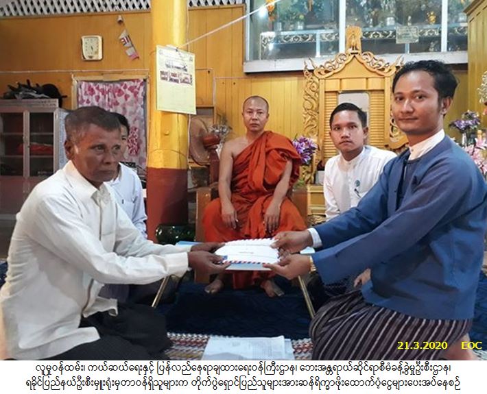 လူမှုဝန်ထမ်း၊ ကယ်ဆယ်ရေးနှင့် ပြန်လည်နေရာချထားရေးဝန်ကြီးဌာန၊ ဘေးအန္တရာယ်ဆိုင်ရာစီမံခန့်ခွဲမှုဦးစီး ဌာန၊ ရခိုင်ပြည်နယ်ဦးစီးမှူးရုံးမှတာဝန်ရှိသူများသည် (၂၁-၃-၂၀၂၀)ရက်နေ့တွင် စစ်တွေမြို့နယ်၊ ဗုဒ္ဓေါမော်ဘုန်းတော်ကြီးကျောင်းရှိ တိုက်ပွဲရှောင်ပြည်သူ အိမ်ထောင်စု(၂၂)စုမှ လူဦးရေ(၈၉)ဦးအတွက် ဆန်ရိက္ခာ (၁) လစာဖိုးထောက်ပံ့ငွေ (၈၀၁,၀၀၀/-) ကျပ် (ရှစ်သိန်းတစ်ထောင်ကျပ်တိတိ) ကို သွားရောက်ထောက်ပံ့ပေးအပ်ခဲ့ပါကြောင်း သတင်းရရှိပါသည်။