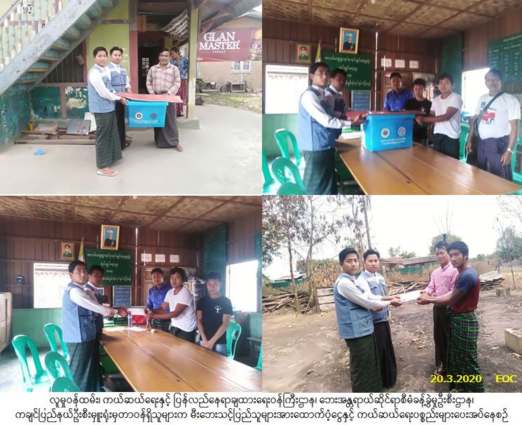 လူမှုဝန်ထမ်း၊ ကယ်ဆယ်ရေးနှင့် ပြန်လည်နေရာချထားရေးဝန်ကြီးဌာန၊ ဘေးအန္တရာယ်ဆိုင်ရာစီမံခန့်ခွဲမှုဦးစီး ဌာန၊ ကချင်ပြည်နယ်ဦးစီးမှူးရုံးမှတာဝန်ရှိသူများသည် မြစ်ကြီးနားမြို့နယ်၊ ရွှေပြည်သာရပ်ကွက်၌ (၁၁-၃-၂၀၂၀) ရက်နေ့တွင် ဖြစ်ပွားခဲ့သောမီးဘေးကြောင့် ဘေးသင့်အိမ်ခြေ(၁)လုံးအတွက် အိမ်ဆောက်ပစ္စည်းဖိုးထောက်ပံ့ငွေ (၂၀၀,၀၀၀/-)ကျပ်၊ လူဦးရေ(၇)ဦးအတွက် ဆန်ရိက္ခာ(၇)ရက်စာဖိုးထောက်ပံ့ငွေ (၁၄,၇၀၀/-)ကျပ်နှင့် ကယ်ဆယ်ရေးပစ္စည်း (၁၇)မျိုး အိမ်ထောင်စု (၁)စုစာတို့ကို (၂၀-၃-၂၀၂၀)ရက်နေ့ (၁၀:၀၀)နာရီအချိန် တွင်လည်းကောင်း၊ ရမ်ပူရပ်ကွက်၊ နယ်မြေ(၂)၌ (၁၅-၁-၂၀၂၀)ရက်နေ့တွင် ဖြစ်ပွားခဲ့သောမီးဘေးကြောင့် ဘေးသင့်အိမ်ခြေ(၁)လုံးအတွက် အိမ်ဆောက်ပစ္စည်းဖိုးထောက်ပံ့ငွေ (၅၀,၀၀၀/-)ကျပ်၊ လူဦးရေ(၈)ဦးအတွက် ဆန်ရိက္ခာ(၇)ရက်စာဖိုးထောက်ပံ့ငွေ (၁၆,၈၀၀/-)ကျပ်နှင့် ကယ်ဆယ်ရေးပစ္စည်း(၁၇)မျိုး အိမ်ထောင်စု(၁)စုစာ တို့ကို (၂၀-၃-၂၀၂၀)ရက်နေ့၊ (၁၁:၀၀)နာရီအချိန်တွင်လည်းကောင်း၊ အာလမ်ကျေးရွာအုပ်စု၌ (၁၂-၃-၂၀၂၀) ရက်နေ့တွင် ဖြစ်ပွားခဲ့သောမီးဘေးကြောင့် ဘေးသင့်အိမ်ခြေ(၁) လုံးအတွက် အိမ်ဆောက်ပစ္စည်းဖိုးထောက်ပံ့ငွေ (၁၀၀,၀၀၀/-)ကျပ်၊ လူဦးရေ(၄) ဦးအတွက် ဆန်ရိက္ခာ (၇)ရက်စာဖိုးထောက်ပံ့ငွေ (၈,၄၀၀/-)ကျပ်နှင့် ကယ်ဆယ်ရေးပစ္စည်း (၁၇)မျိုး အိမ်ထောင်စု(၁)စုစာတို့ကို (၂၀-၃-၂၀၂၀) ရက်နေ့၊ (၁၅:၀၀)နာရီအချိန် တွင်လည်းကောင်း ပြည်သူ့လက်ဝယ်အရောက်ထောက်ပံ့ပေးအပ်ခဲ့ပါကြောင်း သတင်းရရှိပါသည်။