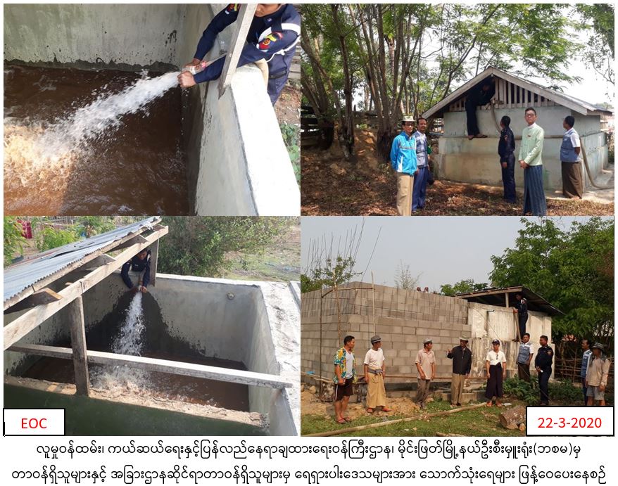 လူမှုဝန်ထမ်း၊ ကယ်ဆယ်ရေးနှင့်ပြန်လည်နေရာချထားရေးဝန်ကြီးဌာန၊ ဘေးအန္တရာယ်ဆိုင်ရာစီမံခန့်ခွဲမှုဦးစီးဌာန၊ မိုင်းဖြတ်မြို့နယ်ဦးစီးမှူးရုံးမှတာဝန်ရှိသူများသည် (၂၂-၃-၂၀၂၀)ရက်နေ့ နံနက်(၁၀:၃၀)နာရီအချိန်တွင် မိုင်းဖြတ်မြို့နယ်၊ ဝမ်နောင်ကျေးရွာတွင် သောက်သုံးရေ ဂါလန် (၁၂၀၀)အားလည်ကောင်း၊ မွန်းလွဲ(၂)နာရီတွင် ပါဆန်းကျေးရွာတွင် ဂါလန် (၁၂၀၀)အားလည်ကောင်း ပြည်နယ်လွှတ်တော်ကိုယ်စားလှယ်ဦးစိုင်းကျောက်၊ မြို့နယ်ပြန်ဆက်ဦးစီးဌာန၊ မြို့နယ်မီးသတ်ဦးစီးဌာန၊ ကျေးရွာအုပ်ချုပ်ရေးမှူးများနှင့်အတူ ကျေးရွာရှိရေလှောင်ကန်များထဲသို့ သွားရောက်ဖြန့်ဝေလှူဒါန်းခဲ့ကြောင်း သတင်းရရှိပါသည်။