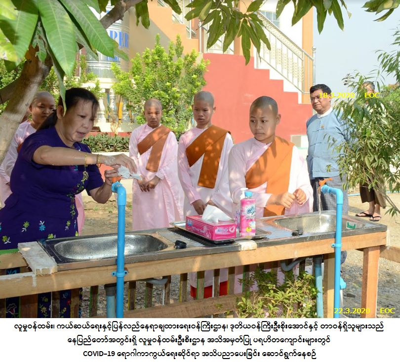 လူမှုဝန်ထမ်း၊ ကယ်ဆယ်ရေးနှင့်ပြန်လည်နေရာချထားရေးဝန်ကြီးဌာန ဒုတိယဝန်ကြီးဦးစိုးအောင်သည် လူမှုဝန်ထမ်းဦးစီးဌာန၊ ညွှန်ကြားရေးမှူးချုပ် ဒေါက်တာစန်းစန်းအေးနှင့် တာဝန်ရှိသူများနှင့်အတူ နေပြည်တော် ပုဗ္ဗသီရိမြို့နယ်ရှိ လူမှုဝန်ထမ်းဦးစီးဌာန အသိအမှတ်ပြု ပရဟိတ ဂေဟာများဖြစ်သော အေးမေတ္တာစံ ပရဟိတ တောင်နီလေးကျောင်းတိုက်ရှိ အေးမေတ္တာစံ လူငယ် ဖွံ့ဖြိုးရေးပရဟိတဂေဟာနှင့် ပြင်ကြီး သာသနာ့ ဝေပုလ္လ သီလရှင်စာသင်တိုက်များသို့သွားရောက်၍ ယခုလတ်တလော ကမ္ဘာ့နေရာ အနှံ့အပြားတွင် ဖြစ်ပွားလျက်ရှိသည့် အသက်ရှုလမ်းကြောင်း ဆိုင်ရာရောဂါ (COVID-19) နှင့် ပတ်သက်၍ သီလရှင်များ၊ ဂေဟာမှူးများ၊ ကြီးကြပ်သူဆရာ၊ ဆရာမများအား ကျန်းမာရေးအသိပညာပေးခြင်းများကို ဆောင်ရွက်ခဲ့ပါသည်။ ဒုတိယဝန်ကြီးက (COVID-19) ရောဂါသည် ယခုအခါ ကမ္ဘာ့နိုင်ငံ(၁၇၇)နိုင်ငံတွင် ကူးစက်ပြန့်ပွားလျက်ရှိပါကြောင်း၊ မိမိတို့နိုင်ငံတွင် ကူးစက်ခံရသူမတွေ့ရှိရသေးသော်လည်း COVID-19 ရောဂါ နှင့်ပတ်သက်၍ ဆောင်ရန်၊ ရှောင်ရန်ကိစ္စများကို မိမိ၏ အရေးကိစ္စသဖွယ် သဘောထားကာ တိတိကျကျလိုက်နာ ဆောင်ရွက်ကြပါရန်နှင့် တတ်နိုင်သမျှဝိုင်းဝန်းပါဝင်ပူးပေါင်းဆောင်ရွက်ကြပါရန် ကျန်းမာရေးနှင့် အားကစား ဝန်ကြီးဌာနက ပြည်သူများထံသို့ မေတ္တာရပ်ခံပန်ကြားထားပါသဖြင့် မိမိတို့ဝန်ကြီးဌာနက အသိအမှတ်ပြု ဖွင့်လှစ်တည်ထောင်ထားသော ပရဟိတဂေဟာများအနေဖြင့်လည်း ပူးပေါင်းပါဝင် လိုက်နာဆောင်ရွက်ရန် လိုအပ်ပါကြောင်း၊ ပရဟိတဂေဟာများသည် ကလေးများစွာကို ပြုစုစောင့်ရှောက်ထားရခြင်း၊ ပြင်ပမှ အလှူရှင်များ လာရောက်လှူဒါန်းမှုရှိခြင်းများကြောင့် လူအများ စုဝေးမှုကြောင့် ကူးစက်ခံရခြင်းမရှိစေရန် မိမိတို့ဝန်ကြီးဌာနမှ (၂၀၂၀ပြည့်နှစ်၊ မတ်လ၊ ၁၈ရက်)နေ့တွင် ထုတ်ပြန်ထားသော အလှူရှင်များသို့ မေတ္တာရပ်ခံချက်ပါအတိုင်း လိုက်နာဆောင်ရွက်ကြစေလိုပါကြောင်း၊ လူ၏ လက်သည်နေရာ အနှံ့အပြားနှင့် ထိတွေ့လုပ်ကိုင်နေရသဖြင့် လက်မှတဆင့် Virus ပိုးများသည် မျက်စိ၊ နှာခေါင်း၊ ပါးစပ်များ အတွင်းဝင်ရောက်ပြီး အသက်ရှုလမ်းကြောင်းသို့ အလွယ်တကူ ကူးစက်နိုင်ပါကြောင်း၊ သို့ဖြစ်ပါ၍ လက်ကို ဆပ်ပြာနှင့်ရေကိုအသုံးပြု၍ စနစ်တကျမကြာခဏ ဆေးကြောသန့်ရှင်းပေးပါရန် (သို့မဟုတ်) အရက်ပြန်အနည်းဆုံး(၆၀) ရာခိုင်နှုန်းပါဝင်သည့် လက်သန့်စင်ဆေးရည်ကို အသုံးပြု၍ သန့်စင်ပေးပါရန်၊ နှာချေ ချောင်းဆိုးသော ကလေးများ၊ ဖျားနာသော ကလေးများရှိပါကလည်း နီးစပ်ရာ ကျန်းမာရေးဆေးခန်းများသို့ သွားရောက်ပြသကုသ ကြပါရန်နှင့် အသိနှင့်သတိ ယှဉ်တွဲပြီး လိုက်နာဆောင်ရွက်ပေးပါရန် ဆွေးနွေးပြောကြားခဲ့ပါသည်။ ထို့နောက် လူမှုဝန်ထမ်းဦးစီးဌာန ညွှ