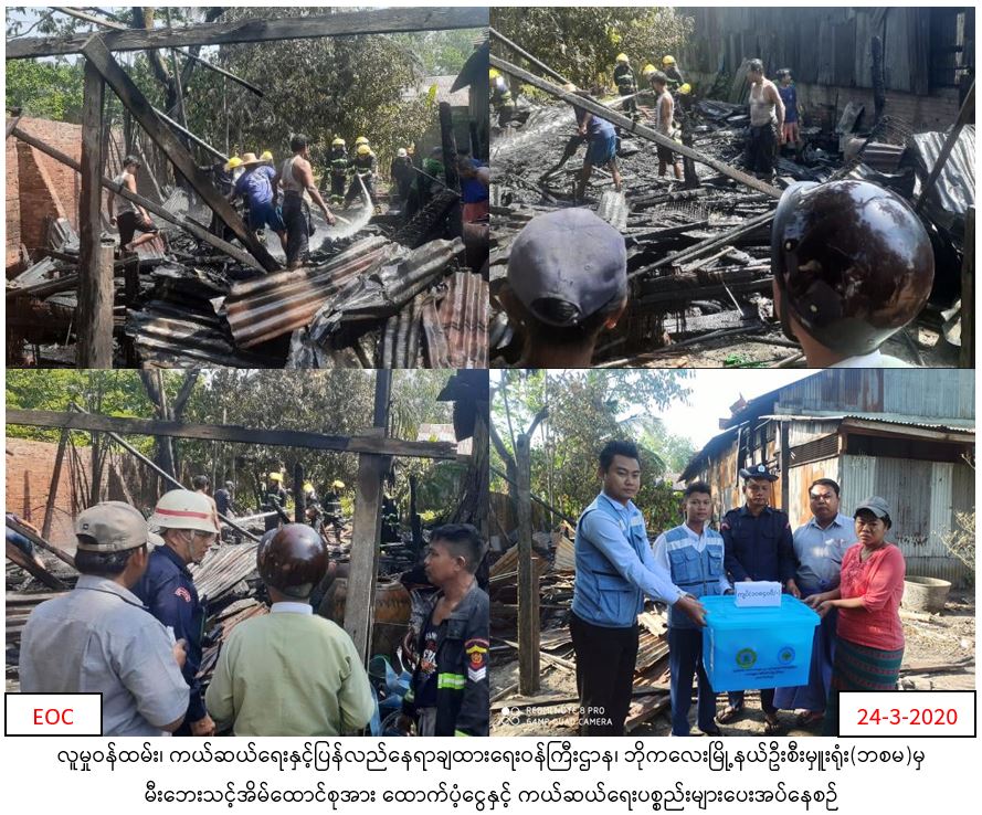 လူမှုဝန်ထမ်း၊ ကယ်ဆယ်ရေးနှင့်ပြန်လည်နေရာချထားရေးဝန်ကြီးဌာန၊ဘေးအန္တရာယ်ဆိုင်ရာစီမံခန့်ခွဲမှုဦးစီးဌာန၊ ဘိုကလေးမြို့နယ်ဦးစီးမှူးရုံးမှတာဝန်ရှိသူများသည် (၂၃.၃.၂၀၂၀)ရက်နေ့တွင် ဘိုကလေးမြို့နယ်၊ သစ်တိုချောင်းကျေးရွာအုပ်စု၊ နတ်ချောင်းကျေးရွာတွင် ဖြစ်ပွားခဲ့သောမီးဘေးကြောင့် ဘေးသင့်အိမ်ထောင်စု(၁)စုအတွက် ကယ်ဆယ်ရေးပစ္စည်း (၁၇)မျိုး စက္ကူပုံးပါ (၁)အိမ်ထောင်စာ တန်ဖိုး (၃၇၇၅၃ိ/-), အိမ်ခြေ(၁)လုံးအတွက် အိမ်ဆောက်ပစ္စည်းဖိုးထောက်ပံ့ငွေ(၁၀၀၀၀၀ိ/-)၊ ဘေးသင့်လူဦးရေ(၄)ဦးအတွက် (၇)ရက်စာဆန်ရိက္ခာဖိုးထောက်ပံံ့ငွေ(၈၄၀၀ိ/-), စုစုပေါင်းထောက်ပံ့ငွေ (၁၀၈၄၀၀ိ/-)ကျပ်တိတိအား (၂၄.၃.၂၀၂၀)ရက်နေ့ နံနက်(၀၈:၃၀)နာရီအချိန်တွင် ဘေးသင့်ပြည်သူများလက်ဝယ်သို့ သက်ဆိုင်ရာတာဝန်ရှိသူများရှေ့မှောက်တွင် ထောက်ပံ့ပေးအပ်ခဲ့ကြောင်း သတင်းရရှိပါသည်။