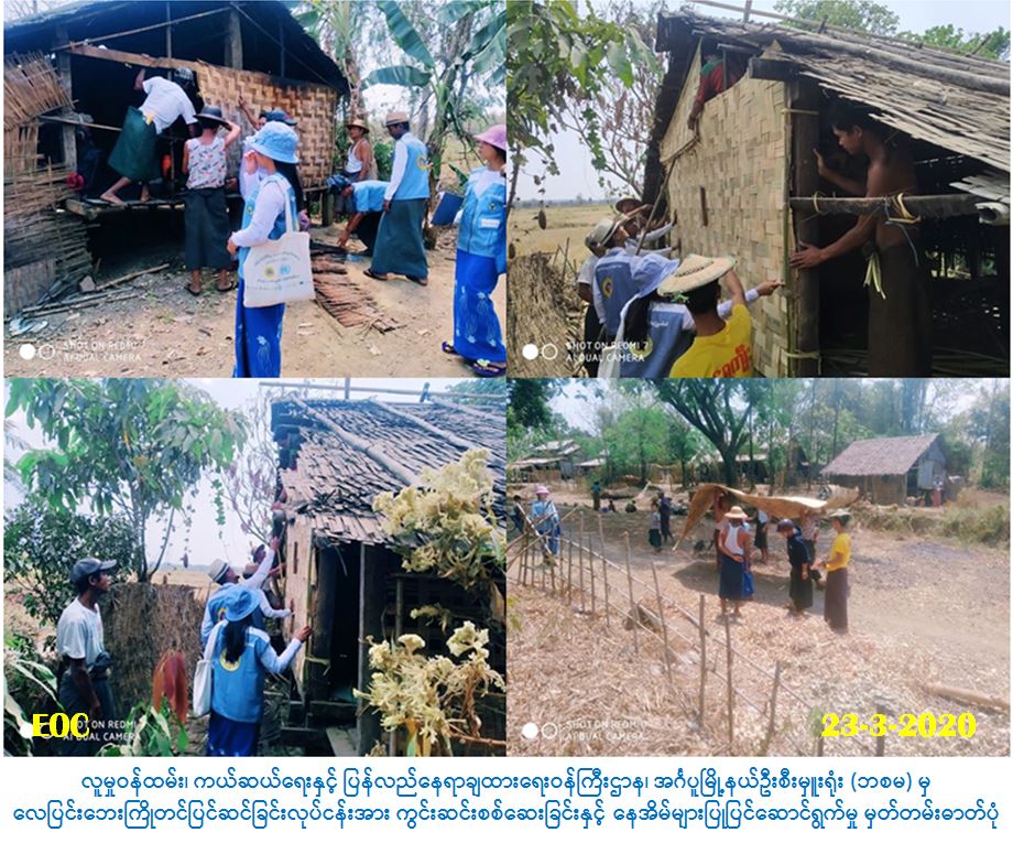 လူမှုဝန်ထမ်း၊ ကယ်ဆယ်ရေးနှင့်ပြန်လည်နေရာချထားရေးဝန်ကြီးဌာန၊ ဘေးအန္တရာယ်ဆိုင်ရာစီမံ ခန့်ခွဲမှုဦးစီးဌာန၊ အင်္ဂပူမြို့နယ်ဦးစီးမှူးရုံးမှ တာဝန်ရှိသူများသည် (၂၃-၃-၂၀၂၀) ရက်နေ့၊ (၀၉:၃၀) နာရီအချိန်တွင် ကုန်းပြင်ကျေးရွာအုပ်စု၊ ဘုရားချောင်ကျေးရွာ၌ အထွေထွေအုပ်ချုပ်ရေးဦးစီးဌာနမှ တာဝန်ရှိသူများ၊ ကျေးရွာအုပ်ချုပ်ရေးမှူး၊ ကျေးရွာအုပ်စု သဘာဝဘေးအန္တရာယ်ဆိုင်ရာ စီမံခန့်ခွဲမှုကော်မတီဝင်များ ၊ ရပ်မိရပ်ဖများနှင့်အတူ လေပြင်းဘေးကြိုတင်ကာကွယ်ရေးလုပ်ငန်း ဆောင်ရွက်မည့် ခိုင်ခံ့မှုအားနည်းသည့် နေအိမ်များအား ကွင်းဆင်းစစ်ဆေးခြင်း၊ နေအိမ်များ ပြုပြင် ခြင်းတို့အား ဆောင်ရွက်ခဲ့ပါကြောင်း သတင်းရရှိပါသည်။