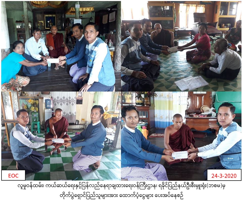 လူမှုဝန်ထမ်း၊ ကယ်ဆယ်ရေးနှင့် ပြည်လည်နေရာချထားရေးဝန်ကြီးဌာန၊ ဘေးအန္တရာယ်ဆိုင်ရာစီမံခန့်ခွဲမှုဦးစီးဌာန၊ ရခိုင်ပြည်နယ်ဦးစီးမှူးရုံးမှ (၂၄-၃-၂၀၂၀)ရက် စစ်တွေမြို့၊ ဃောသိတာရုံဘုန်းတော်ကြီးကျောင်း၌ အိမ်ထောင်စု(၂)စု လူဦးရေ(၅)ဦး၊ အမျိုးသားကျောင်းတိုက်၌ အိမ်ထောင်စု(၃) စု လူဦးရေ(၇) ဦး၊ကယုချောင်းဘုန်းတော်ကြီးကျောင်း၌ အိမ်ထောင်စု (၁)စု လူဦးရေ (၃)ဦး ထပ်တိုးရောက်ရှိလာသည့် တိုက်ပွဲရှောင်ပြည်သူများအတွက် ဆန်ရိက္ခာ(၂)ပတ်စာအားလည်းကောင်း၊ ဆည်ကြီးဘုန်းတော်ကြီးကျောင်း၌ အိမ်ထောင်စု(၅)စု လူဦးရေ(၂၂)ဦး တိုက်ပွဲရှောင်ပြည်သူများအတွက် ဆန်ရိက္ခာတစ်လစာ အားလည်းကောင်း သွားရောက်ထောက်ပံ့ခဲ့ကြောင်း သတင်းရရှိပါသည်။