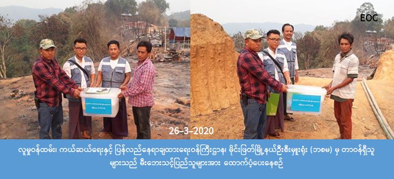 လူမှုဝန်ထမ်း၊ ကယ်ဆယ်ရေးနှင့် ပြန်လည်နေရာချထားရေးဝန်ကြီးဌာန၊ ဘေးအန္တရာယ်ဆိုင်ရာ စီမံ ခန့်ခွဲမှုဦးစီးဌာန၊ မိုင်းဖြတ်မြို့နယ် ဦးစီးမှူးရုံးမှတာဝန်ရှိသူများသည် (၂၅-၃-၂၀၂၀)ရက်နေ့၊ (၁၄:၁၅) နာရီ အချိန်တွင် တာချီလိတ်ခရိုင်၊ မိုင်းဖြတ်မြို့နယ်၊ နမ့်ယွန်းအုပ်စု၊ မက်မွန်ကျယ်ကျေးရွာ၌ ဖြစ်ပွားခဲ့သော မီးဘေးကြောင့် နေအိမ်(၁၈)လုံး၊ အိမ်ထောင်စု (၁၈) စုမှ လူဦးရေ (၉၈) ဦးမီးဘေးသင့်ခဲ့ရာ အဆိုပါ ဘေးသင့်အိမ်ထောင်စု (၁၈) စုမှပျဉ်ထောင်၊ သွပ်မိုးနေအိမ် (၁၀) လုံးအတွက် အိမ်ဆောက်ပစ္စည်းဖိုး ထောက်ပံ့ငွေ (၂၀၀၀,၀၀၀) ကျပ်နှင့် သက်ကယ်မိုး၊ ထရံကာနေအိမ်(၈)လုံးအတွက် အိမ်ဆောက်ပစ္စည်း ဖိုးထောက်ပံ့ငွေ (၈၀၀,၀၀၀)ကျပ်၊ ဘေးသင့်လူဦးရေ(၉၈) ဦးအတွက်ဆန်ရိက္ခာ (၇) ရက်စာဖိုး ထောက်ပံ့ ငွေ (၂၀၅,၈၀၀) ကျပ်၊ စုစုပေါင်းထောက်ပံ့ငွေ (၃၀၀၅,၈၀၀)ကျပ်နှင့် ကယ်ဆယ်ရေးပစ္စည်း (၂၂) မျိုး (၁၈) အိမ်ထောင်စုစာတို့ကို (၂၆-၃-၂၀၂၀) ရက်နေ့၊ (၁၅:၀၀) နာရီအချိန်တွင် မြို့နယ်ပြန်ဆက်ဦးစီး ဌာန၊ အုပ်စုအုပ်ချုပ်ရေးမှူး၊ အုပ်စုရပ်ကျေးစာရေးတို့နှင့်အတူသွားရောက်၍ ပြည်သူ့လက်ဝယ် အရောက် ထောက်ပံ့ပေးခဲ့ကြောင်း သိရှိရပါသည်။
