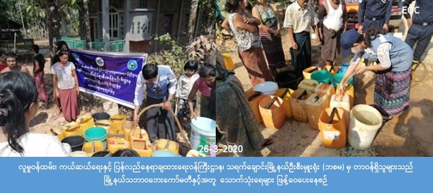 လူမှုဝန်ထမ်း၊ ကယ်ဆယ်ရေးနှင့် ပြန်လည်နေရာချထားရေးဝန်ကြီးဌာန၊ ဘေးအန္တရာယ်ဆိုင်ရာ စီမံခန့်ခွဲမှုဉီးစီး ဌာန၊ တနင်္သာရီတိုင်းဒေသကြီး၊ သရက်ချောင်းမြို့နယ်ဉီးစီးမှူးရုံးမှ တာဝန်ရှိသူများသည် ရေရှားပါးနေသည့် သရက်ချောင်းမြို့နယ်၊ ပန်းချီရှောင်ကျေးရွာအုပ်စု၊ ပန်းချီရှောင်ကျေးရွာသို့ (၂၆-၃-၂၀၂၀)ရက်နေ့ (၈:၃ဝ)ချိန်၌ မြို့နယ်သဘာဝဘေးကော်မတီနှင့်အတူ အိမ်ခြေ(၁၀၀) လုံး၊ လူဦးရေ(၅၄၀)ဦးအတွက် သောက်သုံးရေ (၃,၆၀၀) ဂါလံအား သွားရောက်ဖြန့်ဝေပေးခဲ့ကြောင်း သိရှိရပါသည်။