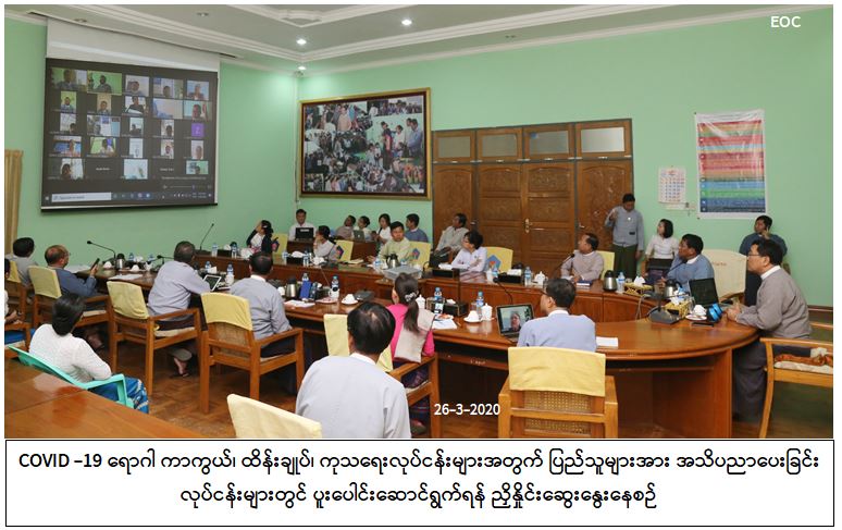 COVID -19 ရောဂါ ကာကွယ်၊ ထိန်းချုပ်၊ ကုသရေးလုပ်ငန်းများအတွက် ကျန်းမာရေးနှင့် အားကစား ဝန်ကြီးဌာန၊ အထွေထွေအုပ်ချုပ်ရေးဦးစီးဌာနတို့နှင့်အတူ လူမှုဝန်ထမ်း၊ ကယ်ဆယ်ရေးနှင့် ပြန်လည်နေရာချ ထားရေးဝန်ကြီးဌာန၏ ဝန်ထမ်းများက ပြည်သူများနှင့်ပူးပေါင်းပြီး ရပ်ကွက်၊ ကျေးရွာများအရောက် ပညာပေးခြင်းလုပ်ငန်းများတွင် ထိရောက်စွာ ပူးပေါင်းဆောင်ရွက်ပေးရန် လူမှုဝန်ထမ်း၊ ကယ်ဆယ်ရေးနှင့် ပြန်လည်နေရာချထားရေးဝန်ကြီးဌာနရှိ နေပြည်တော်ကောင်စီအပါအဝင် ပြည်နယ်နှင့် တိုင်းဒေသကြီး (၁၅)ခုရှိ ဦးစီးမှူးများအား အင်တာနက်ကွန်ယက် Video Conferencing ဖြင့် ယနေ့နံနက်ပိုင်းက ညှိနှိုင်း ဆွေးနွေးခဲ့သည်။