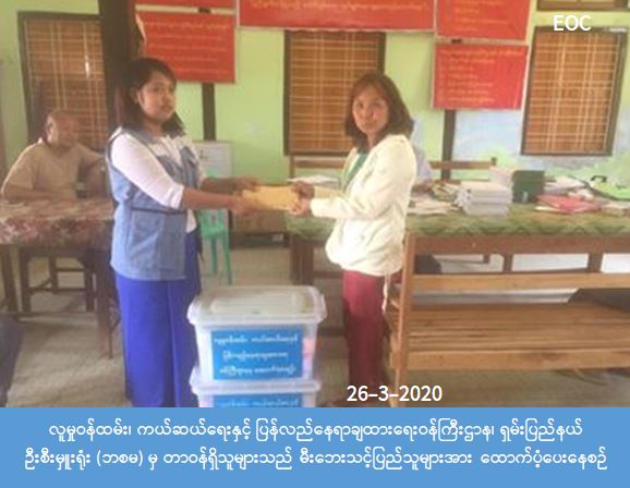 လူမှုဝန်ထမ်း၊ ကယ်ဆယ်ရေးနှင့်ပြန်လည်နေရာချထားရေးဝန်ကြီးဌာန၊ ဘေးအန္တရာယ်ဆိုင်ရာစီမံခန့်ခွဲမှု ဦးစီးဌာန၊ ရှမ်းပြည်နယ်ဦးစီးမှူးရုံးမှ တာဝန်ရှိသူများသည် (၂၅-၃-၂၀၂၀) ရက်နေ့၊ တောင်ကြီးမြို့၊ တောင်နီကျေးရွာတွင် ဖြစ်ပွားခဲ့သော မီးဘေးကြောင့် အိမ်ခြေ(၁)လုံး၊ အိမ်ထောင်စု (၁) စု၊ လူဦးရေ (၃) ဉီး မီးဘေးသင့်ခဲ့ရာ လူဦးရေ (၃) ဦးအတွက် ဆန်ရိက္ခာ(၇) ရက်စာ (၆,၃၀၀)ကျပ်၊ အိမ်ဆောက်ပစ္စည်းဖိုး (၁၀၀,၀၀၀) ကျပ်၊ စုစုပေါင်းထောက်ပံ့ရန်ပုံငွေ(၁၀၆,၃၀၀)ကျပ်၊ အိမ်ထောင်စု(၁)စုအတွက် (၄၆,၅၅၃) ကျပ်တန်ဖိုးရှိ ကယ်ဆယ်ရေးပစ္စည်း (၂၂)မျိုးတို့ကို (၂၆-၃-၂၀၂၀) ရက်နေ့(၁၃:၃၀)အချိန်တွင် ဘေးသင့် ပြည်သူလက်ဝယ်သို့သွားရောက် ထောက်ပံ့ပေးခဲ့ကြောင်း သိရှိရပါသည်။