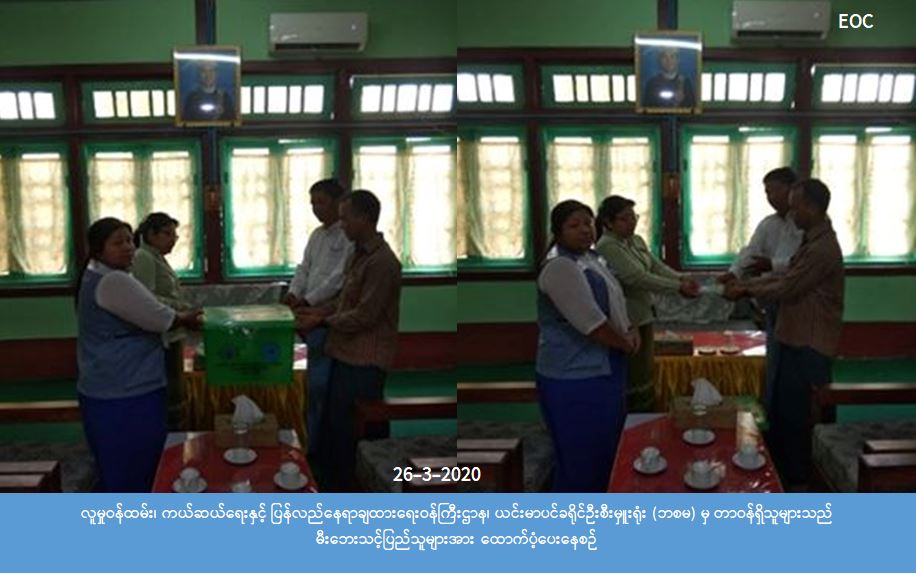 စစ်ကိုင်းတိုင်းဒေသကြီး၊ ယင်းမာပင်ခရိုင်၊ ပုလဲမြို့နယ်၊ ကန့်ဒေါင့်ကျေးရွာအုပ်စု၊ ကန့်ဒေါင့်ကျေးရွာ၌ (၂၅-၃-၂၀၂၀) ရက်နေ့တွင် မီးလောင်မှုဖြစ်ပွားခဲ့ရာ အိမ်ခြေ (၁) လုံး မီးလောင်ဆုံးရှုံးခဲ့မှုကြာင့် ကယ်ဆယ်ရေးပစ္စည်း (၁၇) မျိုး၊ အိမ်ဆောက်ပစ္စည်းထောက်ပံ့ငွေ (၁၀၀,၀၀၀) ကျပ်နှင့် ဆန်ရိက္ခာထောက်ပံ့ငေ ွ(၈,၄၀၀) ကျပ်အား (၂၆-၃-၂၀၂၀) ရက်နေ့တွင် လူမှုဝန်ထမ်း၊ ကယ်ဆယ်ရေးနှင့် ပြန်လည်နေရာချထားရေးဝန်ကြီးဌာန၊ ဘေးအန္တရာယ်ဆိုင်ရာ စီမံခန့်ခွဲမှုဦးစီးဌာန၊ ယင်းမာပင်ခရိုင်ဦးစီးမှူးရုံးမှ တာဝန်ရှိသူများသည် ပုလဲမြို့နယ်အထွေထွေအုပ်ချုပ်ရေးဦးစီးဌာနသို့ သွားရောက်ထာက်ပံ့ပေးခဲ့ပါကြောင်း သိရှိရပါသည်။