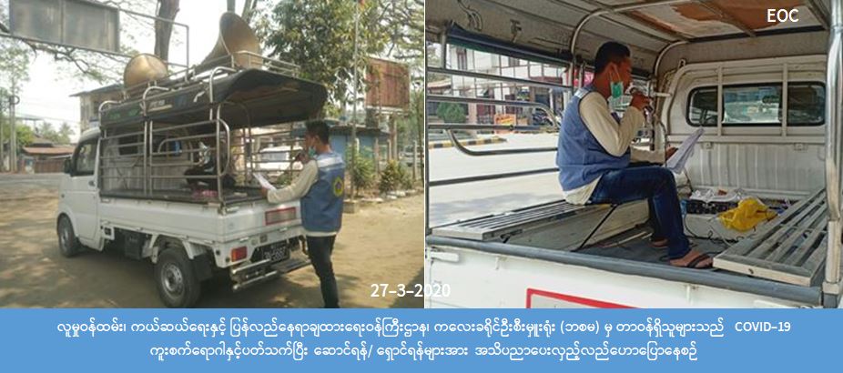 လူမှုဝန်ထမ်း၊ ကယ်ဆယ်ရေးနှင့် ပြန်လည်နေရာချထားရေးဝန်ကြီးဌာန၊ ဘေးအန္တရာယ်ဆိုင်ရာ စီမံခန့်ခွဲမှုဉီးစီး ဌာန၊ ကလေးခရိုင်ဦးစီးမှူးရုံးမှ တာဝန်ရှိသူများသည် (၂၇-၃-၂၀၂၀) ရက်နေ့ နေ့လည် (၁၂:၃၀)မှ စတင်ပြီး ကလေးမြို့ပေါ်ရပ်ကွက် (၂၀) သို့ လှည့်လည်ပြီး COVID -19 ကူးစက်ရောဂါနှင့်ပတ်သတ်ပြီး ဆောင်ရန်/ ရှောင်ရန် တို့အား ရပ်ကွက်နေပြည်သူတို့အား အသိပညာပေးဟော ပြောဆောင်ရွက်ခဲ့ ကြောင်း သိရှိရပါသည်။
