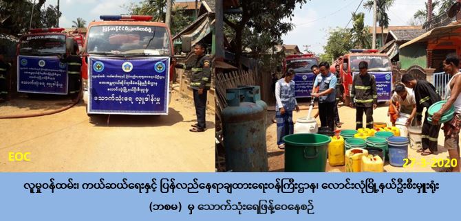 လူမှုဝန်ထမ်းကယ်ဆယ်ရေးနှင့် ပြန်လည်နေရာချထားရေးဝန်ကြီးဌာန၊ ဘေးအန္တရာယ်ဆိုင်ရာ စီမံခန့်ခွဲမှုဦးစီးဌာန၊ လောင်းလုံးမြို့နယ်ဦးစီးမှူးရုံးမှ တာဝန်ရှိသူများသည် လောင်းလုံးမြို့နယ်မီးသတ်ဦးစီးဌာနမှ တာဝန်ရှိသူများနှင့် ပူးပေါင်း၍ (၂၇-၃-၂၀၂၀) ရက်နေ့တွင် လောင်းလုံးမြို့နယ်၊ မကျွန်းမော်ကျေးရွာ၌ သောက်သုံးရေ ဂါလံ (၂၈၀၀) ကို ဖြန့်ဝေပေးခဲ့ပါကြောင်း သတင်းရရှိပါသည်။