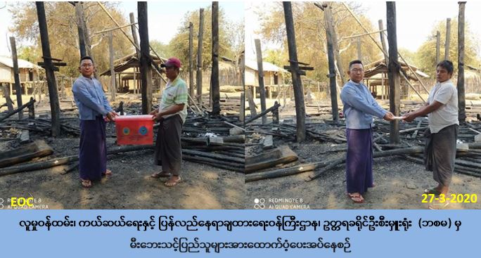 လူမှုဝန်ထမ်း၊ ကယ်ဆယ်ရေးနှင့် ပြန်လည်နေရာချထားရေးဝန်ကြီးဌာန၊ ဘေးအန္တရာယ်ဆိုင်ရာ စီမံခန့်မှုဦးစီးဌာန၊ ဥတ္တရခရိုင်ဦးစီးမှူးရုံးမှတာဝန်းရှိသူများသည် ပြည်ထောင်နယ်မြေ၊ နေပြည်တော်၊ ဥတ္တရခရိုင်၊ တပ်ကုန်းမြို့နယ်၊ သံပုရားကုန်းကျေးရွာအုပ်စု၊ သဲချောင်းကျေးရွာ၌ (၂၇-၃-၂၀၂၀) ရက်နေ့ (၀၉:၀၀) အချိန်တွင် ဖြစ်ပွားခဲ့သော မီးဘေးကြောင့် လုံးဝပျက်စီးလူနေအိမ်(၂)လုံးအတွက် အိမ်ဆောက်ပစ္စည်းဖိုး ထောက်ပံ့ငွေ (၃၀၀,၀၀ဝ) ဘေးသင့်လူဦးရေ (၇) ဦးအတွက် ဆန်ရိက္ခာဖိုး ထောက်ပံ့ငွေ (၁၄,၇၀ဝ) ကျပ်၊ စုစုပေါင်း ထောက်ပံ့ငွေ (၃၁၄,၇၀ဝ) ကျပ်နှင့် ကယ်ဆယ်ရေးပစ္စည်း (၁၇) မျိုး အိမ်ထောင်စု (၂) စုစာ တို့အား (၁၅:၀၀) အချိန်တွင် ဘေးသင့်ပြည်သူများလက်ဝယ်သို့ သွားရောက်ထောက်ပံ ခဲ့ပါကြောင်း သတင်းရရှိပါသည်။