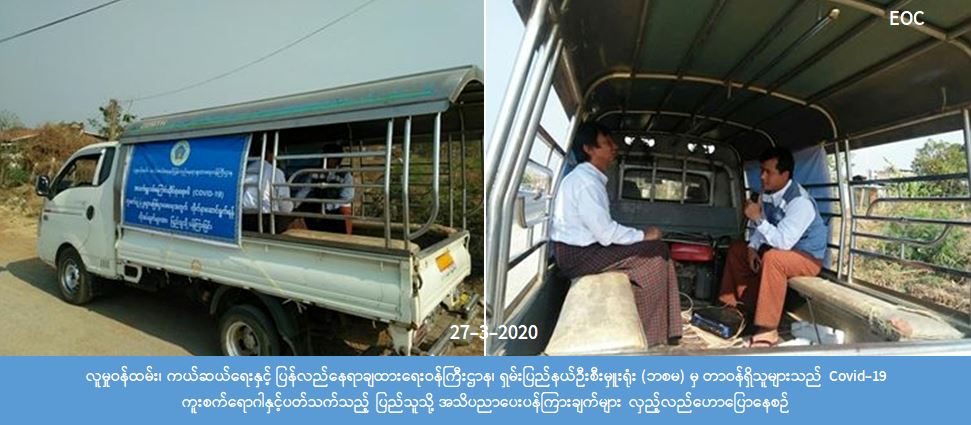 ဘေးအန္တရာယ်ဆိုင်ရာစီမံခန့်ခွဲမှုဉီးစီးဌာန၊ ရှမ်းပြည်နယ်ဉီးစီးမှူးရုံးမှ တာဝန်ရှိသူများသည်(၂၇-၃-၂၀၂၀)ရက်နေ့တွင် တောင်ကြီးမြို့နယ်နှင့် ဟိုပုံးမြို့နယ်များမှရပ်ကွက်၊ ကျေးရွာများသို့လှည့်လည်၍အသက် ရူလမ်းကြောင်းဆိုင်ရာကူးစက်ရောဂါ COVID 19 ကာကွယ်တားဆီးထိန်းချုပ်ကုသရေးဆိုင်ရာ ပြည်သူသို့ပန်ကြားချက်အသိပညာပေးမှုအားအသံချဲ့စက် ဖြင့်လှည့်လည်ဟောပြောဆောင်ရွက်ခဲ့ပါကြောင်းနှင့် ဟိုပုံးမြို့ပေါ်ရပ်ကွက်များနှင့်နမ့်ခုတ်ကျေးရွာ တောင်ကြီးမြို့နယ်၊ မဲတဲကျေးရွာနှင့် ပင်ငိုကျေးရွာများတွင်ဟောပြောဆောင်ရွက်ခဲ့ပါကြောင်း သိရှိရပါသည်။