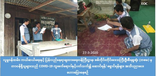 လူမှုဝန်ထမ်း၊ ကယ်ဆယ်ရေးနှင့် ပြန်လည်နေရာချထားရေးဝန်ကြီးဌာန၊ ဘေးအန္တရာယ်ဆိုင်ရာစီမံခန့်ခွဲမှုဦးစီးဌာန၊ စစ်ကိုင်းတိုင်းဒေသကြီးဦးစီးရုံး မှ တာဝန်ရှိသူများသည် ၊ကျေးရွာအုပ်ချုပ်ရေးမှူးများ၊ ရပ်မိ/ရပ်ဖများနှင့်အတူ (၂၇-၃-၂၀၂၀) ရက်နေ့တွင် စစ်ကိုင်းတိုင်းဒေသကြီး၊ မုံရွာခရိုင်၊မုံရွာမြို့နယ်အတွင်းရှိ တောင်ပုလူကျေးရွာ၊ ကျောက်စစ်ပုံ(မ)ကျေးရွာနှင့် ခိုးသန်းကျေးရွာများတွင် Covid-19 ရောဂါကူးစက်ပျံ့နှံမှုများမဖြစ်ပွားစေနိုင်ရန်အတွက် အများပြည်သူများ အလွယ်တကူသိရှိ လိုက်နာဆောင်ရွက်ရန်များကို အသိပေးဆောင်ရွက်ခြင်းလုပ်ငန်းများဆောင်ရွက်ခဲ့ပါကြောင်း သိရပါသည်။