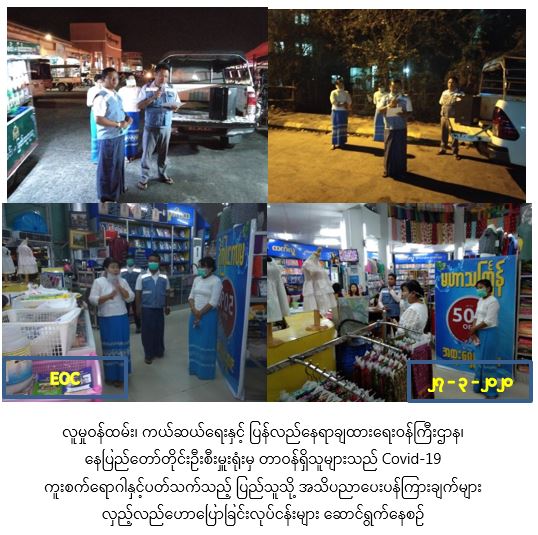 လူမှုဝန်ထမ်း၊ ကယ်ဆယ်ရေးနှင့် ပြန်လည်နေရာချထားရေးဝန်ကြီးဌာန၊ ဘေးအန္တရာယ်ဆိုင်ရာစီမံခန့်ခွဲမှုဦးစီးဌာန၊ ပြည်ထောင်စုနယ်မြေ၊ နေပြည်တော်တိုင်းဦးစီးမှူးရုံး၊ ဥတ္တရခရိုင်ဦးစီးမှူးရုံးနှင့် နေပြည်တော်လူမှုဝန်ထမ်းရုံးမှ တာဝန်ရှိသူများသည် (၂၇-၃-၂၀၂၀) ရက်နေ့ (၁၉:၀၀) အချိန်မှ (၂၁:၀၀) အချိန်အထိ ပြည်သူများအား COVID-19 ရောဂါကူးစက်ပြန့်နှံ့မှုများ မဖြစ်ပွားစေရန်အတွက် သိရှိလိုက်နာဆောင်ရွက်ရမည့် အချက်များနှင့် ပတ်သက်၍ အသိပညာပေးခြင်းကို ဇမ္ဗူသီရိမြို့နယ်၊ သပြေကုန်းစျေး၊ မြို့မစျေးနှင့် ရပ်ကွက်များအတွင်းရှိ ပြည်သူများသို့ ထိရောက်စွာ လိုက်လံအသိပေးဆောင်ရွက်လျက်ရှိပါကြောင်း သတင်းရရှိပါသည်။