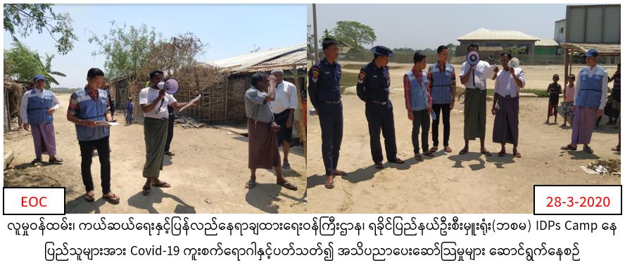လူမှုဝန်ထမ်း၊ ကယ်ဆယ်ရေးနှင့်ပြန်လည်နေရာချထားရေးဝန်ကြီးဌာန၊ ဘေးအန္တရာယ်ဆိုင်ရာစီမံခန့်ခွဲမှုဦးစီးဌာန၊ ရခိုင်ပြည်နယ်ဦးစီးမှူးရုံးမှ တာဝန်ရှိသူများသည် (၂၈-၃-၂၀၂၀)ရက် (၁၃:၀၀)နာရီတွင် စစ်တွေမြို့၊ သက္ကယ်ပြင် IDP စခန်းရှိ ပြည်သူများအတွက် Covid-19 ကူးစက်ရောဂါနှင့်ပတ်သက်ပြီး ဆောင်ရန်ရှောင်ရန်များအား မြို့နယ်မီးသတ်ဦးစီးဌာန၊ ကော်မတီဝင်များနှင့်ပူးပေါင်း၍ အသိပညာပေးဆော်သြခဲ့ကြောင်း သတင်းရရှိပါသည်။